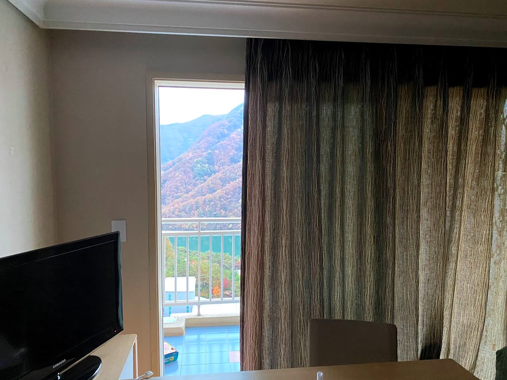 남한강 뷰와 뒷쪽 산뷰를 선택 할 수 있는데 다행이 남한강 뷰 방을 잡았습니다.