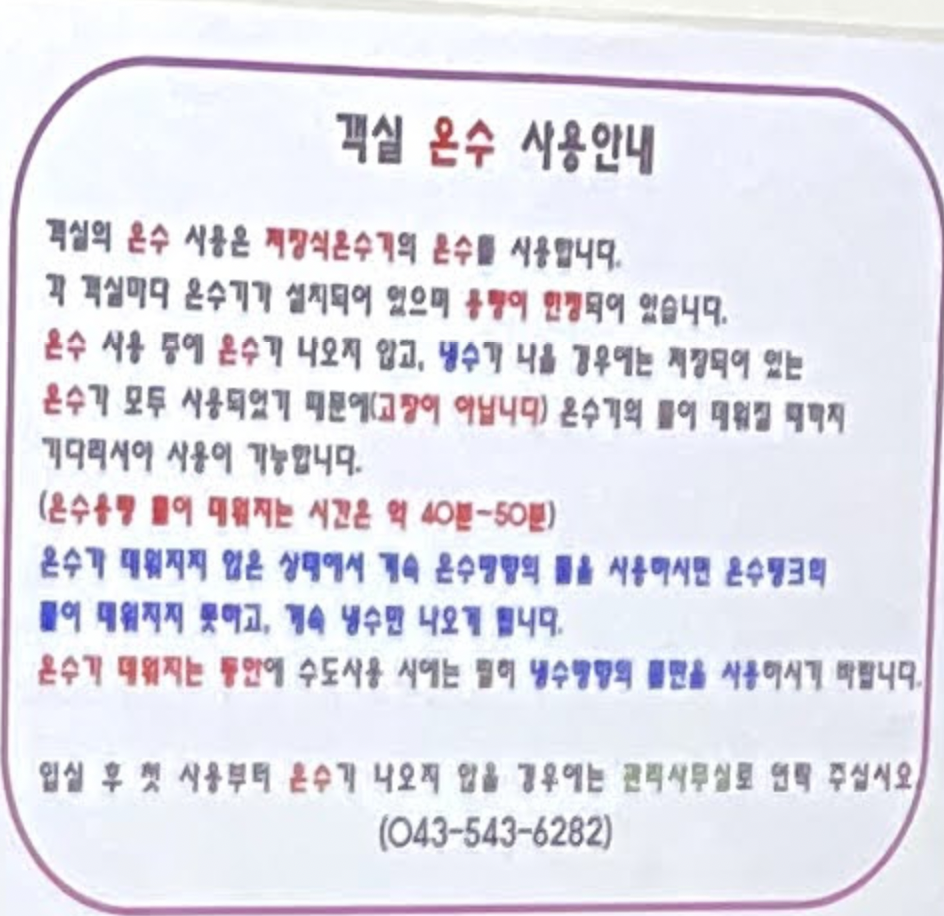 온수통을 사용해서 물을 데워 쓰는 것 같은데 통에 있는 온수를 모두 써버리면 40분 정도는 온수가 안나온다고 설명되어 있었습니다.