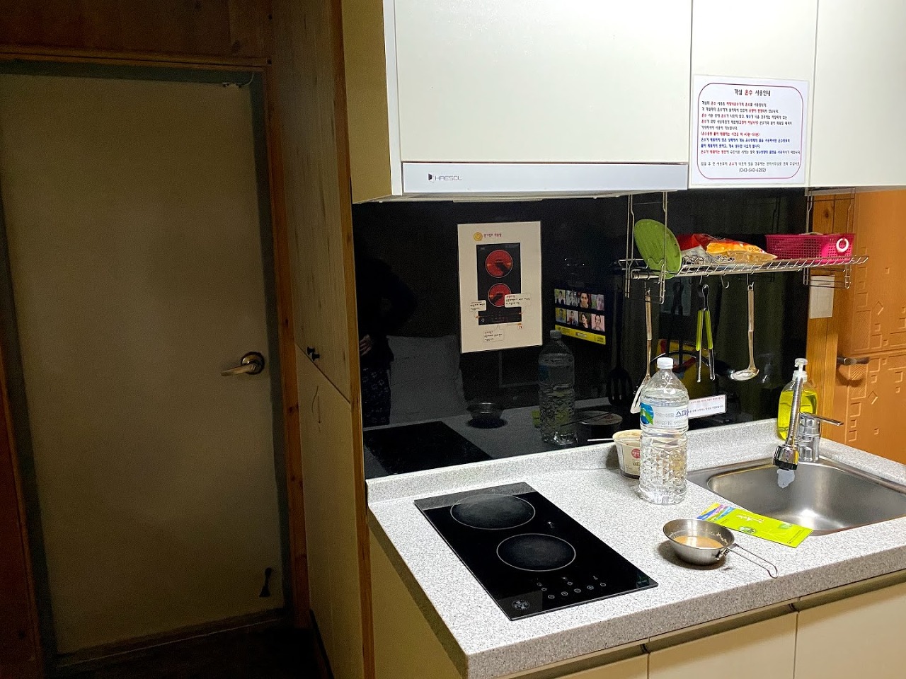 시설은 작은 싱크대와 조리기구가 있으며 냉장고 에어컨 tv 등이 있습니다.