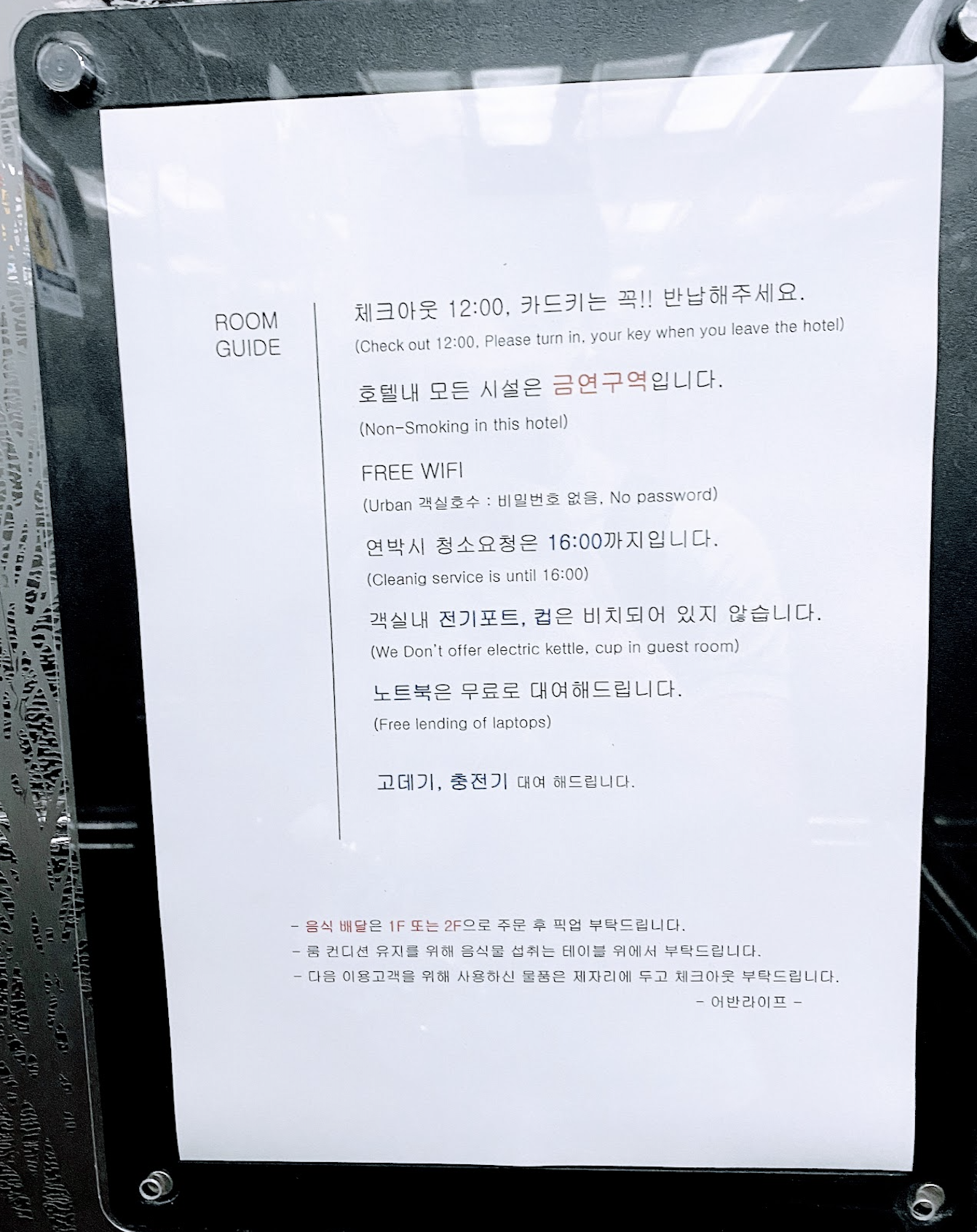 호텔내 모든 시설은 금연이라고 되어 있는데 엘리베이터 내리자 마자 담배 냄새가 진동을 합니다. 복도가 환기가 잘 안되는 건가 싶기도 합니다.