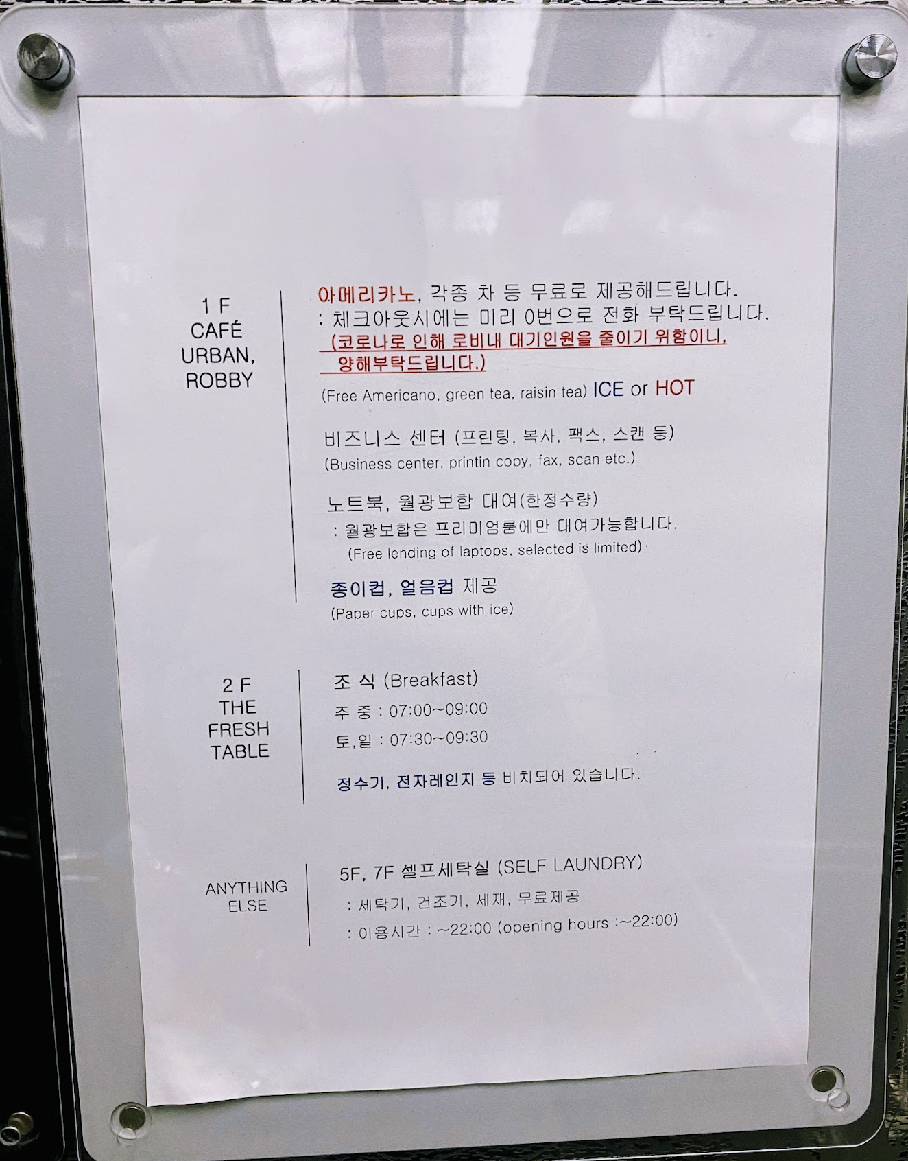체크인은 1층 로비에서 가능 합니다. 남자 직원분이 계셨는데 조식 관련 문의 드리니 다른 손님을 안내 해야 되기 때문인지 엘리베이터에 설명 있으니 읽어 보라고 하십니다.