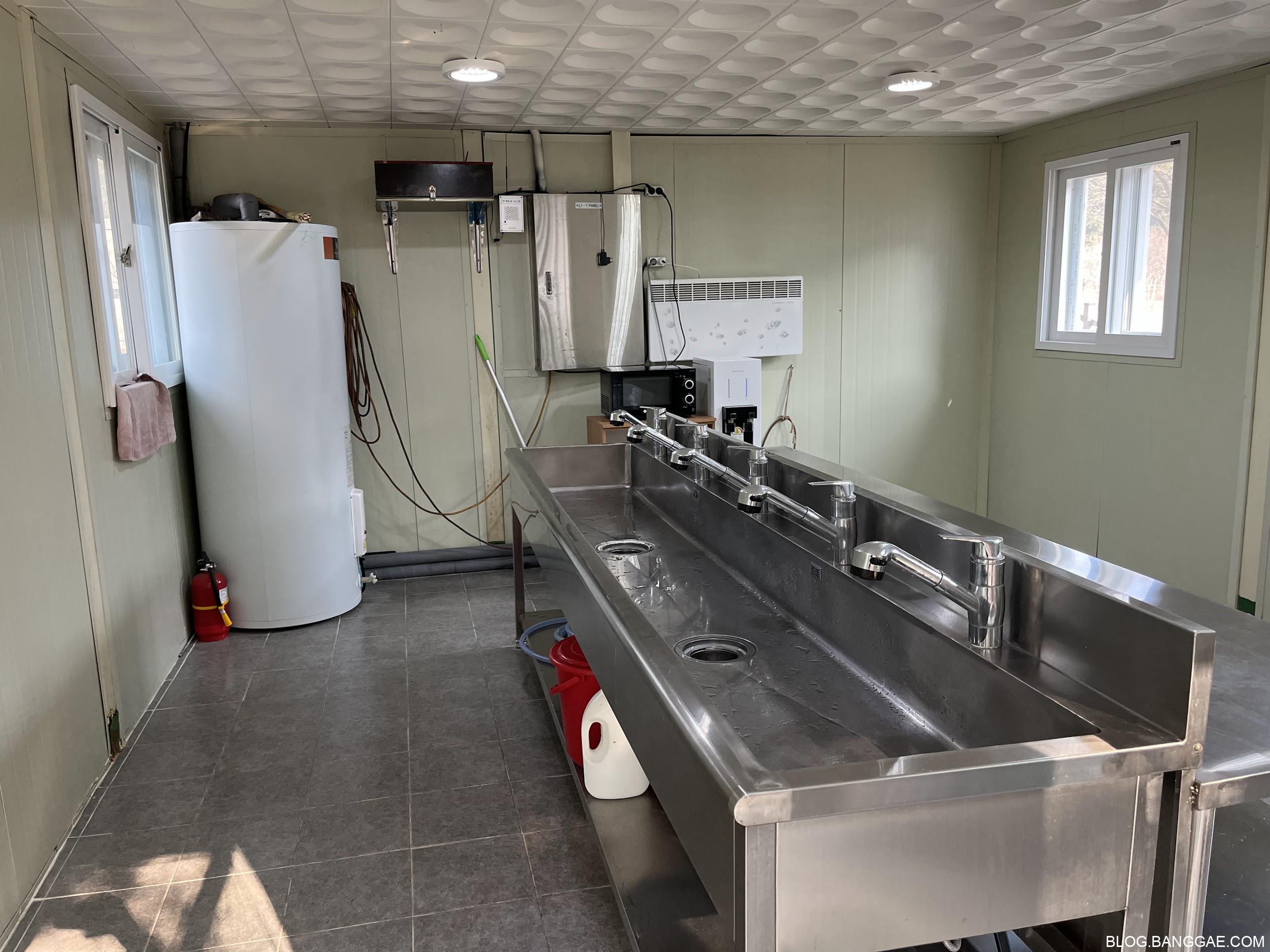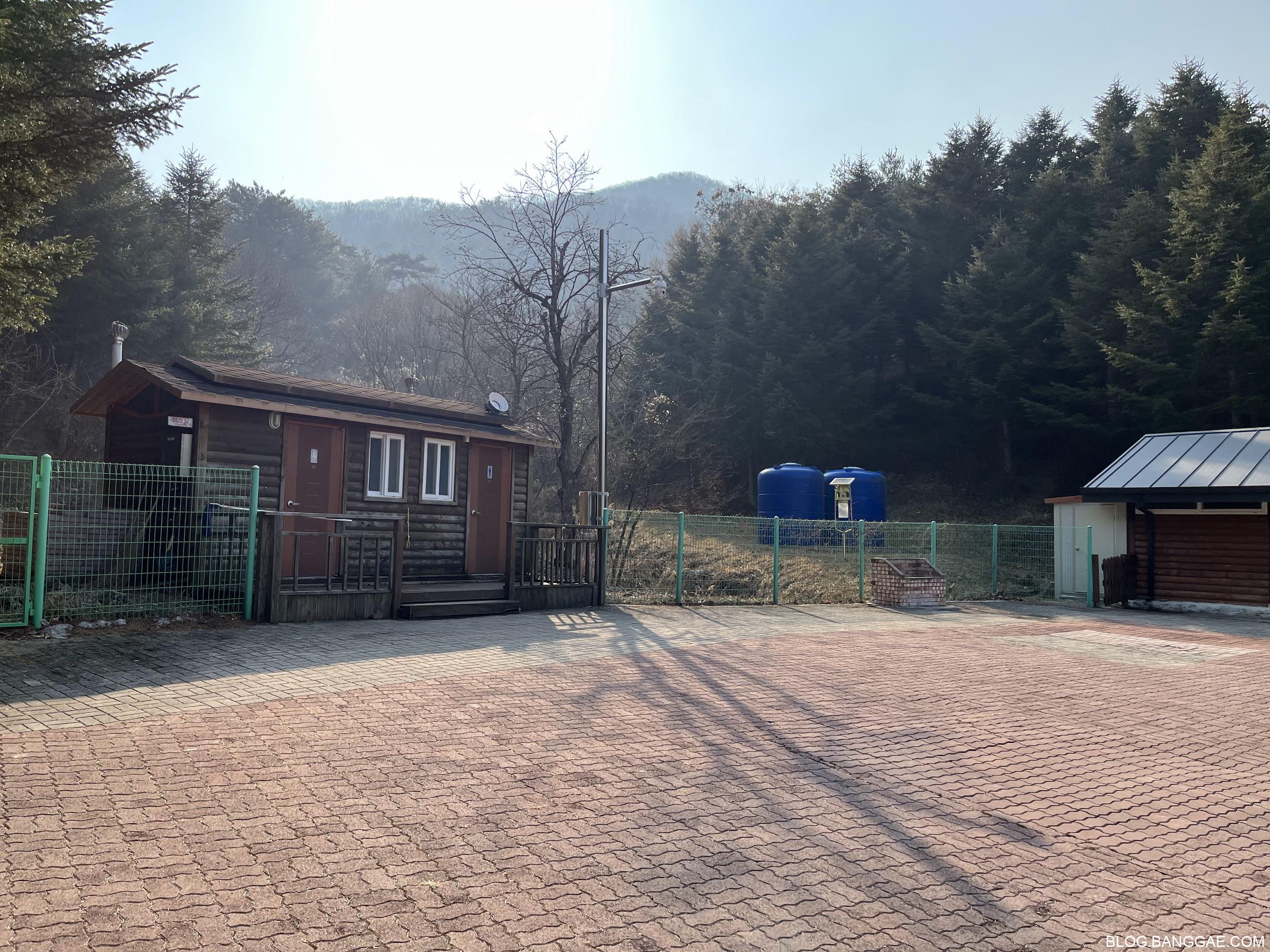 사진 왼쪽에는 화장실이고 오른쪽에는 샤워장입니다. 화장실은 사용하는 인원에 비하면 좁다는 생각이 들었어요. 서대산쪽에라도 하나 더 늘리는 게 좋지 않을까 하는 생각이 들었습니다.