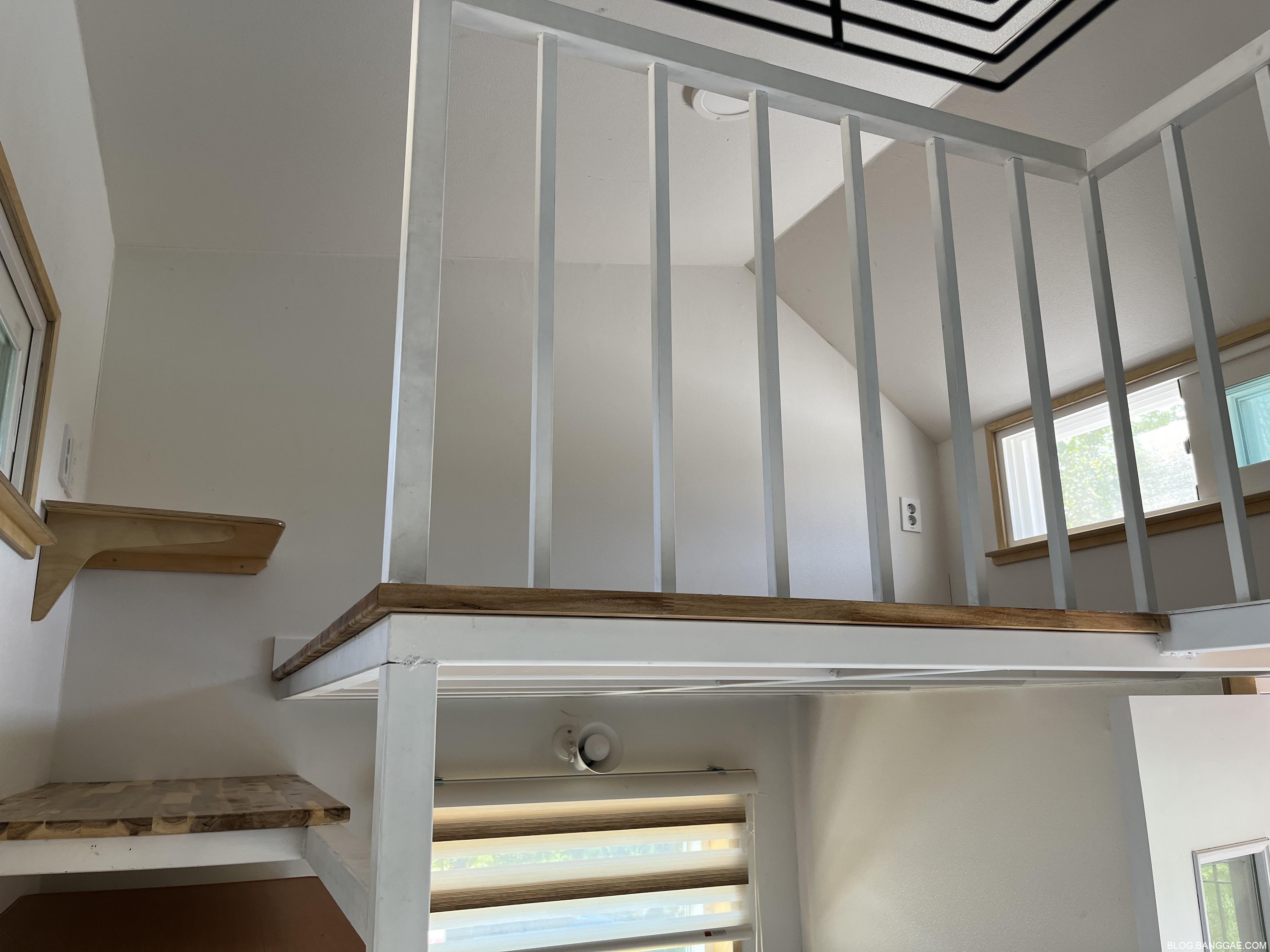 2층에 잠을 잘 수 있는 공간이 있습니다. 천장이 낮고 이동 하는 계단이 조금 위험해 보이기도 합니다.