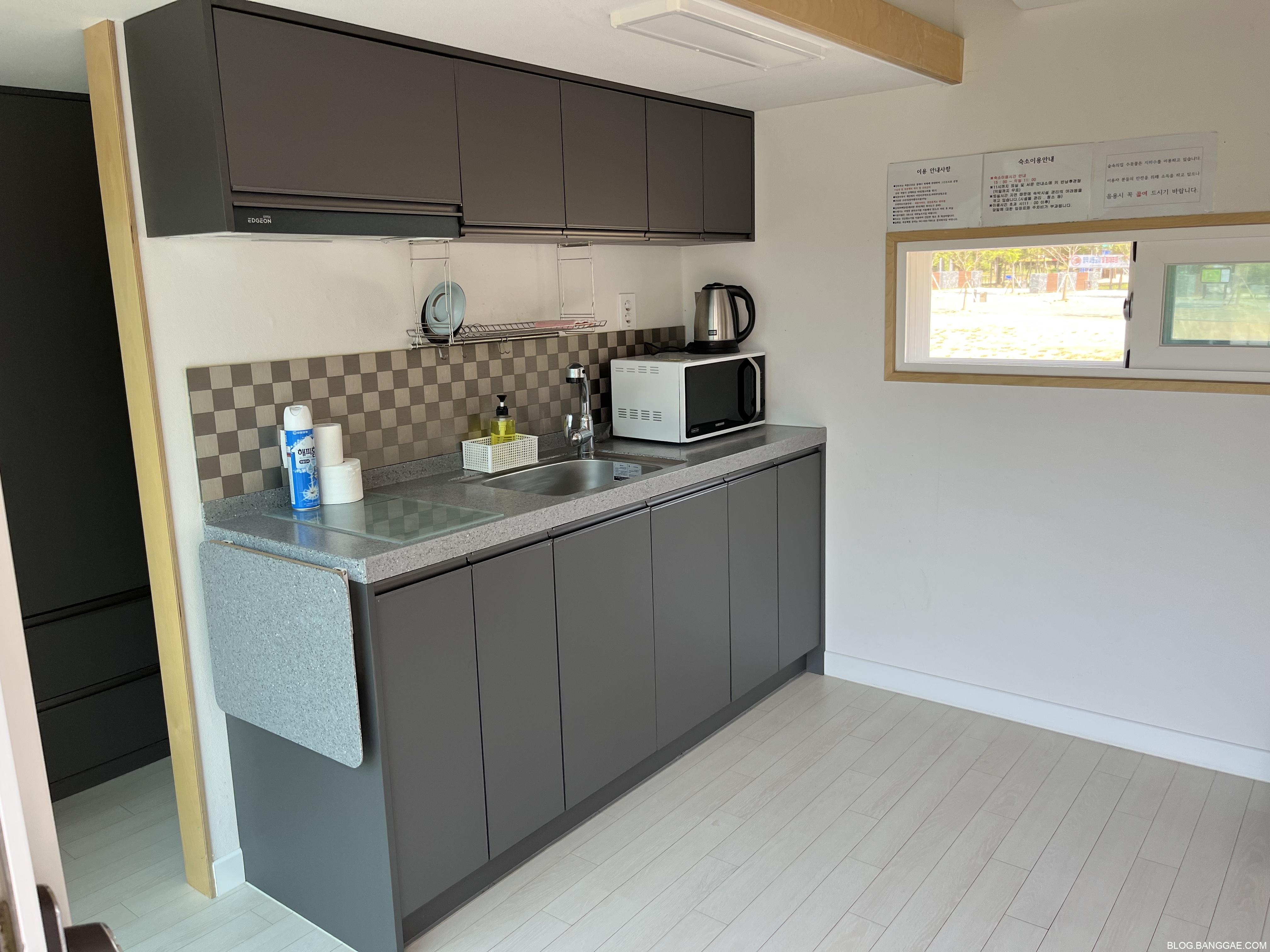 숙소에는 작은 냉장고와 에어컨이 하나씩 있으며 난방은 되는데 침구는 없으며 취사는 외부 취사장에서 가능 합니다.