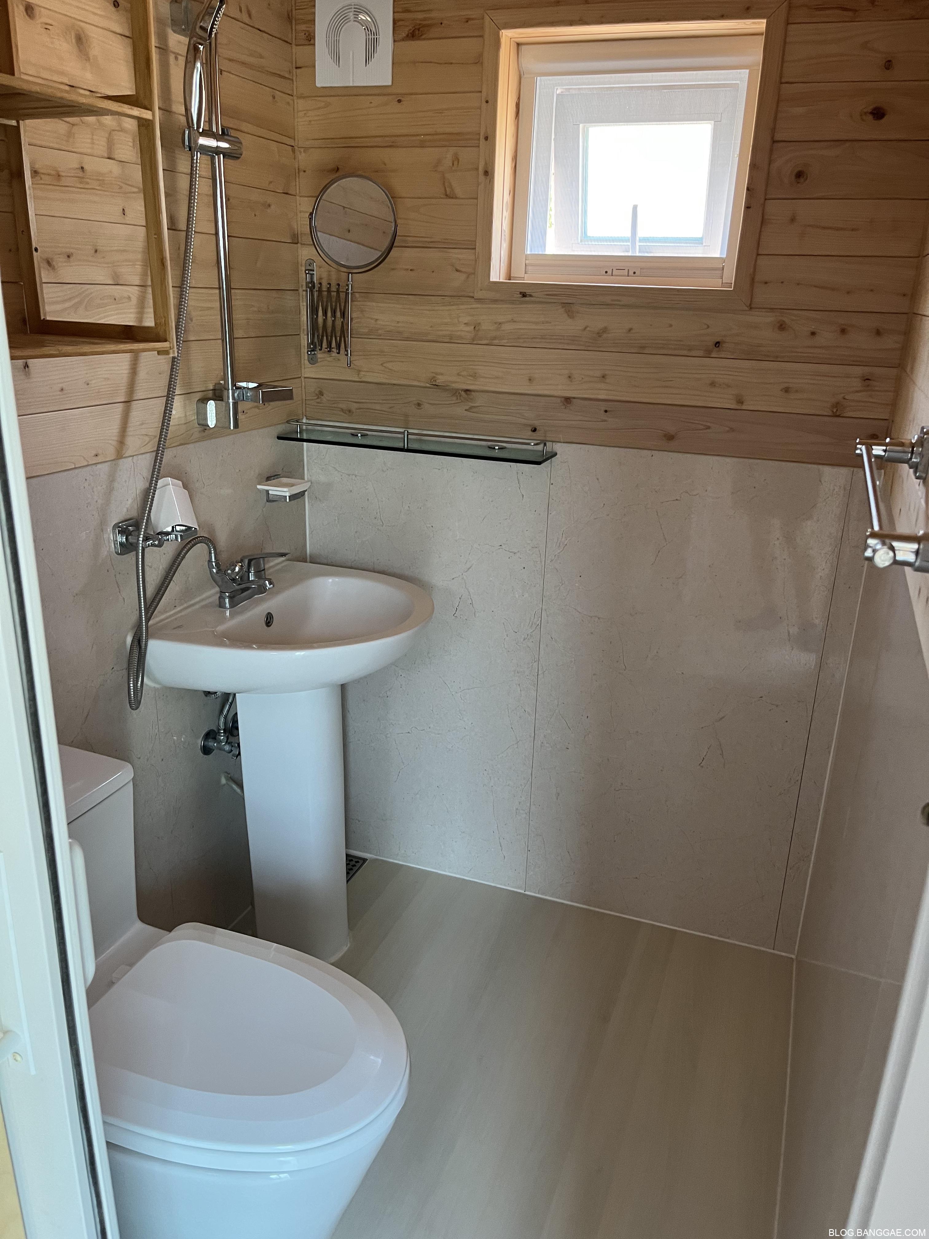 화장실은 샤워 가능 하고 깨끗합니다. 하지만 변기에서 밤새 물이 울컥 되는 소리가 납니다.