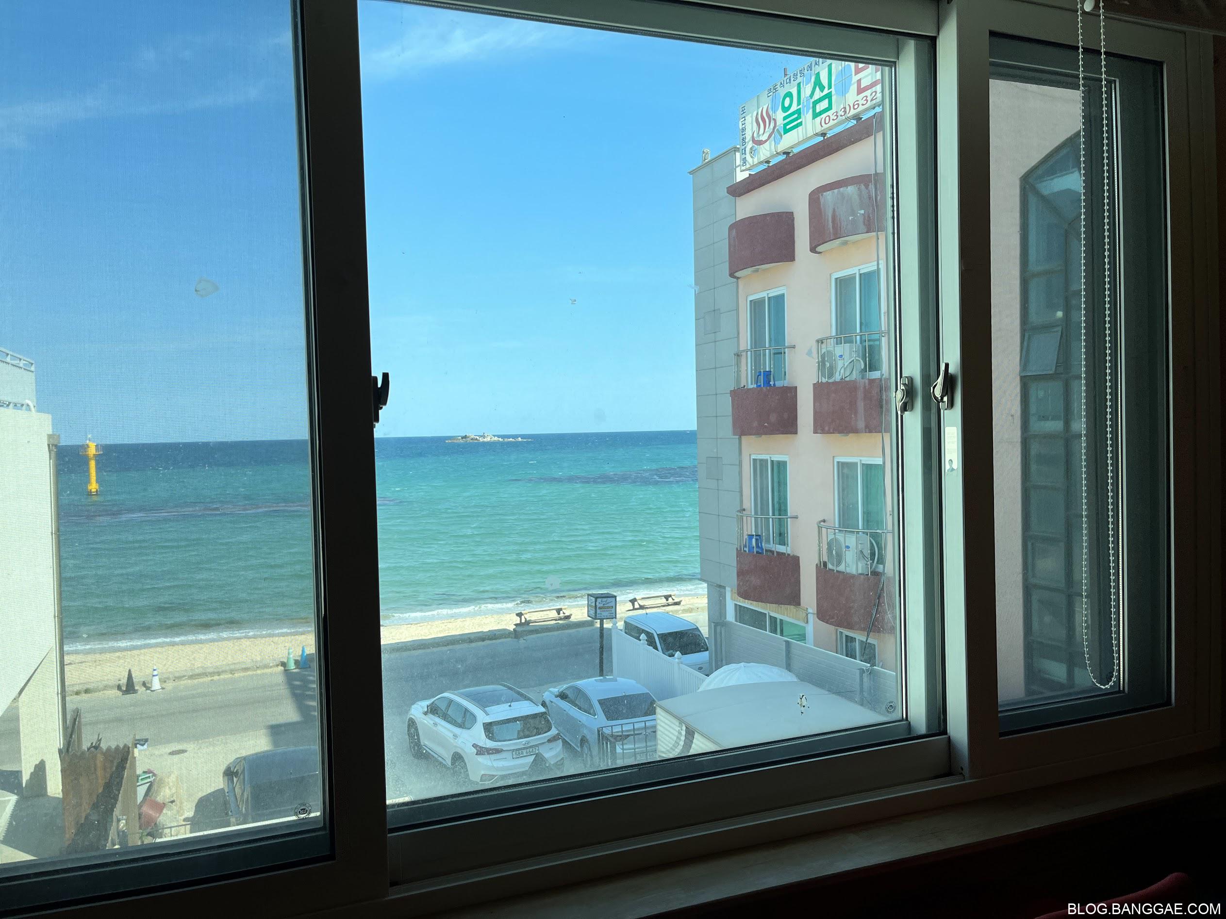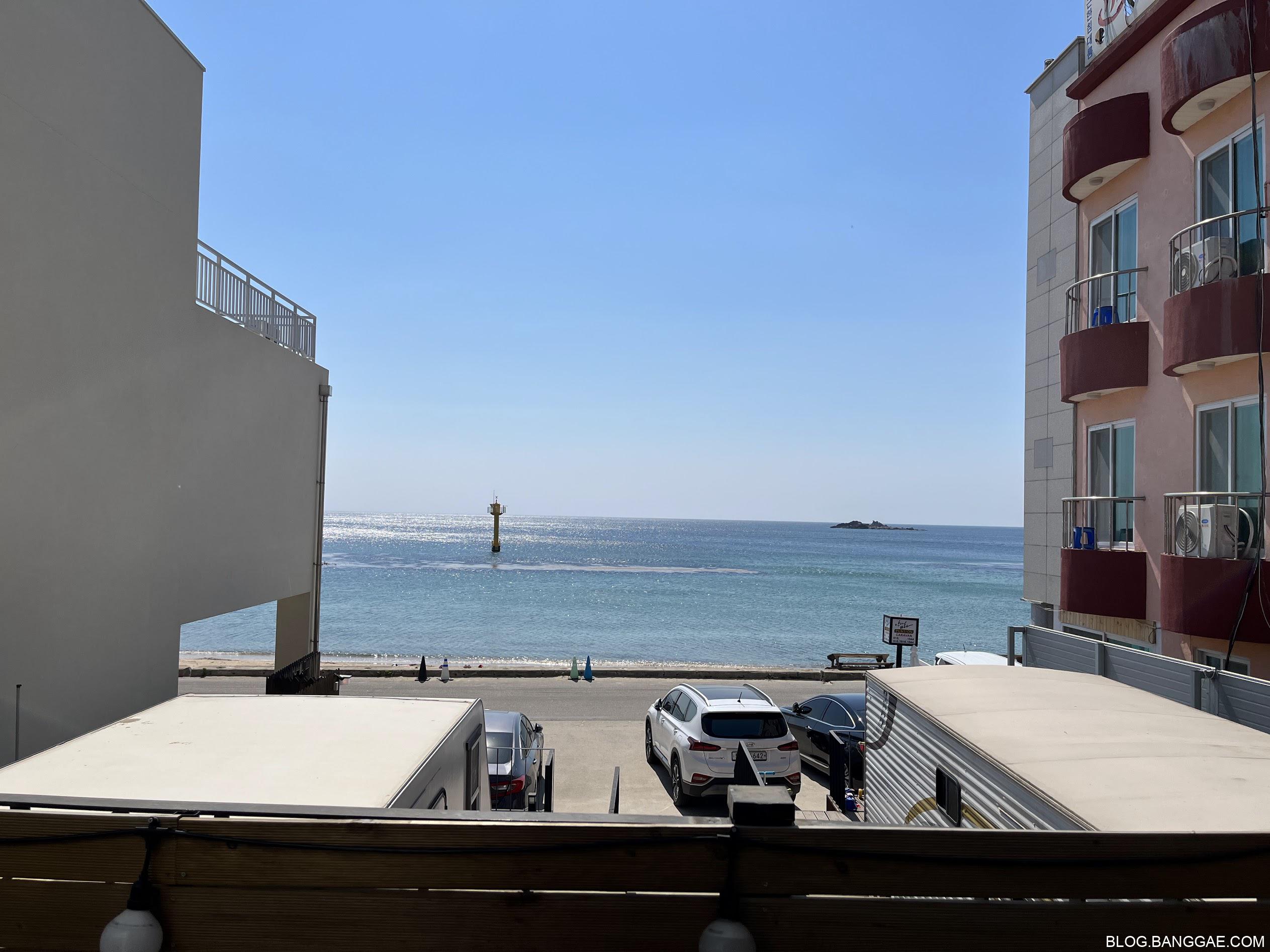 숙소에서 바로 바다가 보입니다. 양쪽에 다른 숙소들이 바다를 가리긴 하지만 보기 좋은 경치 입니다.