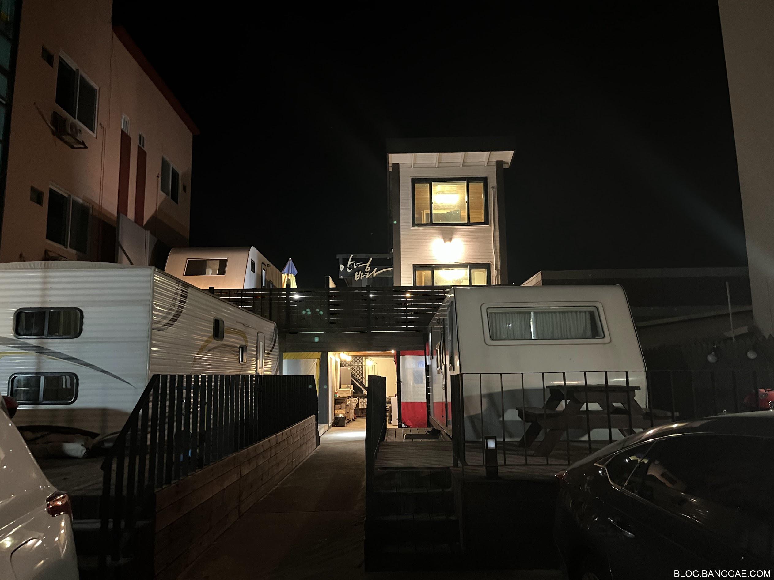 달과 바다가 너무 환상적이라 산책을 다녀 오는길에 펜션을 한장 찍었습니다. 사진 오른쪽에 2층같이 보이는 건물이 프리홈 입니다.