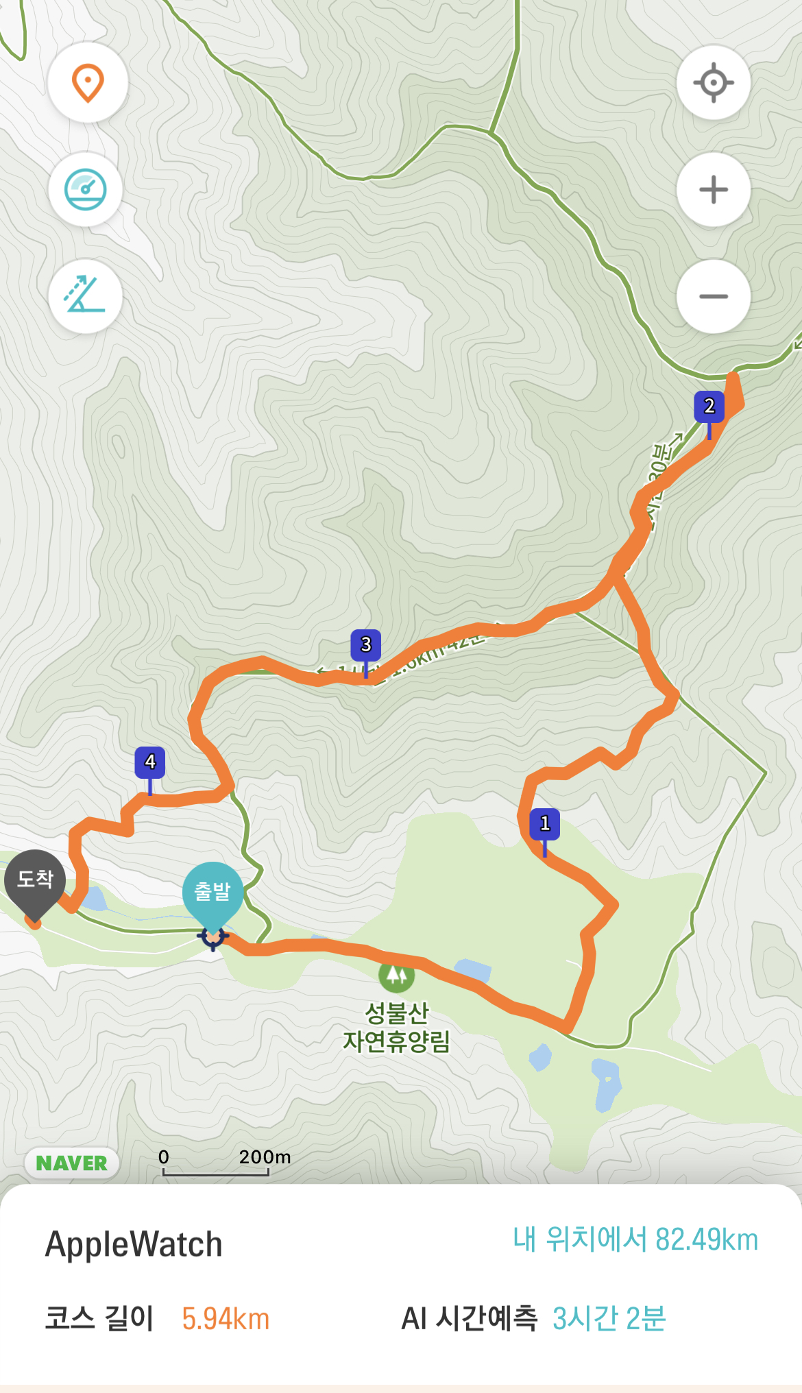 원래 아래 사진에서 도착지로 보이는 곳에서 올라가 데크로드를 통해 많이들 가시는 것 같은데 자연휴양림 공원을 통해 올라가 성불산 정상을 찍고 3봉-2봉-1봉 순으로 내려왔습니다.