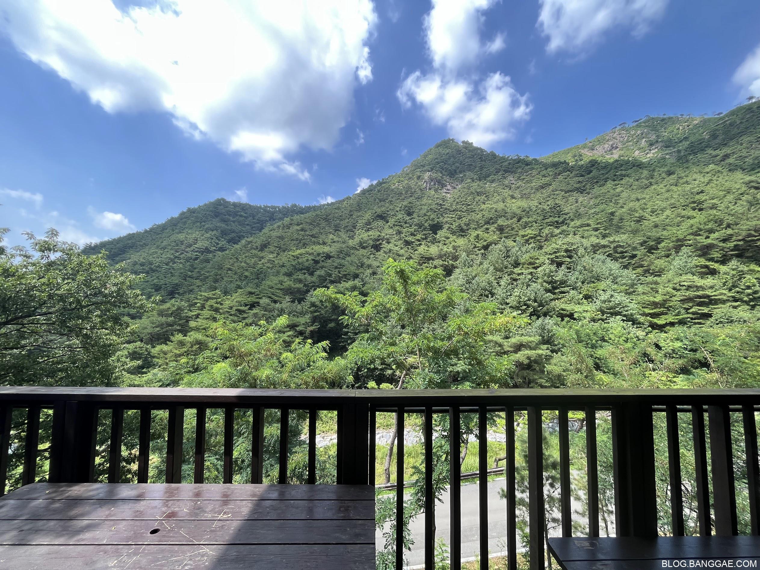 발코니에는 식사를 할 수 있는 테이블이 있고 성불산이 눈앞에 펼쳐집니다. 낮에는 그늘이 없어 불편함은 있어요.