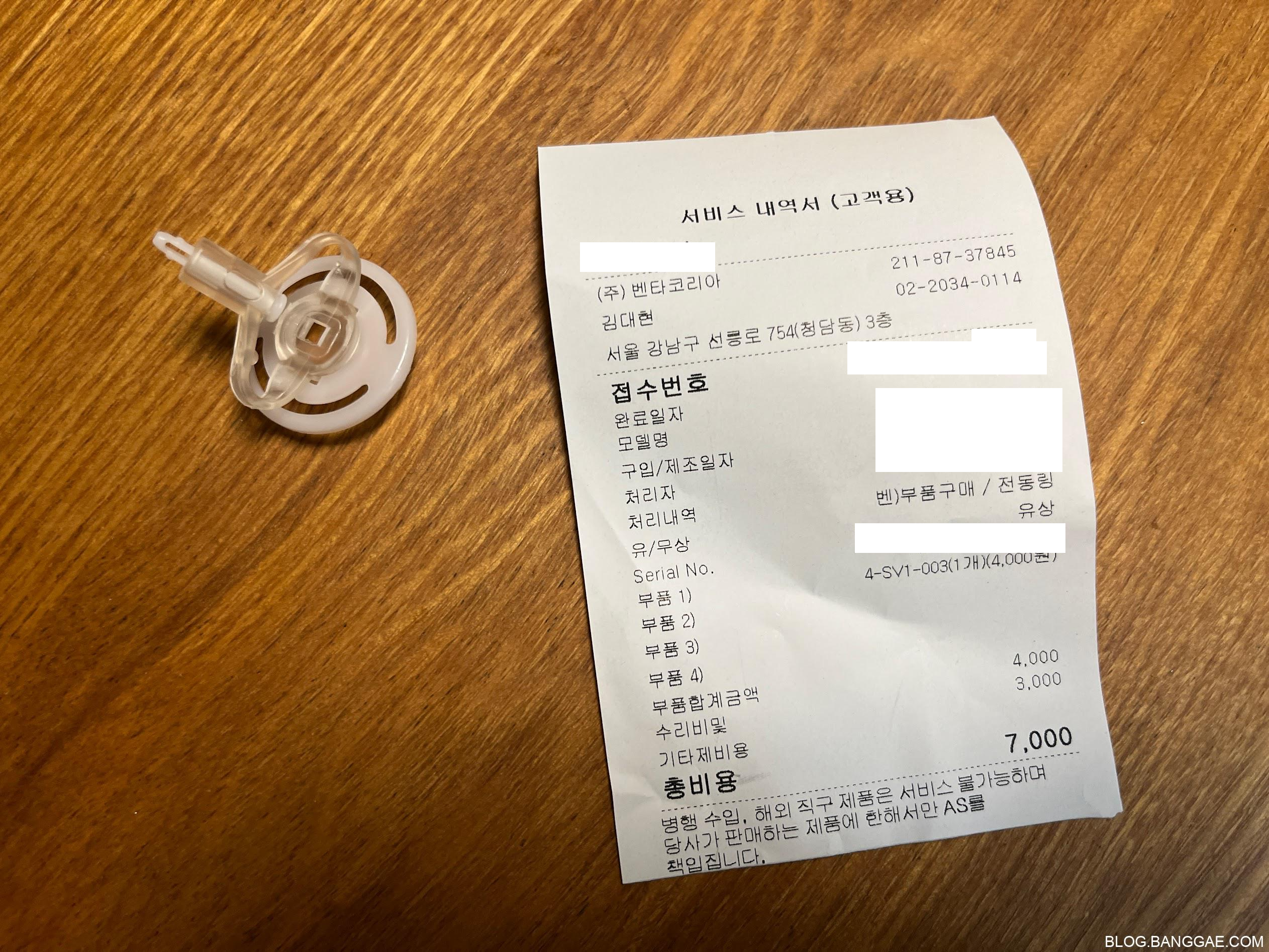 2-3만원 정도에 구입 해야 하나를 고민하다가 벤타 코리아 전화번호를 확인하고 상담을 시작하니 국내 판매 제품에 대해 부품 구입이 가능 하다고 합니다. 부품명은 전동링 이며 비용은 택배비 포함 7천원 입니다. 국내 판매 제품 여부는 제품의 시리얼 번호로 확인 합니다.