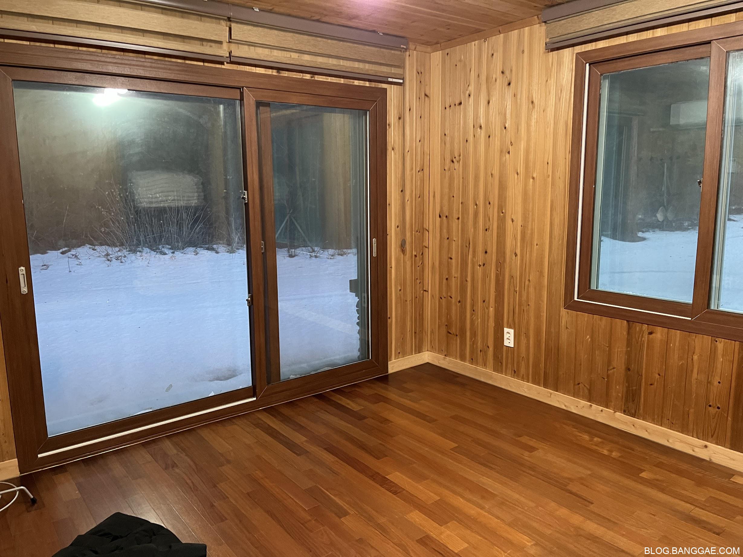 방에도 숙소 뒷편 숲을 보여 주는 통창 샷시가 있습니다.