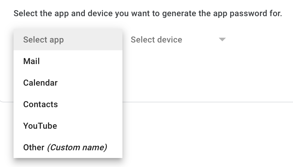 아래 폴다운 메뉴에서 Mail을 선택하고 옆의 메뉴에서 어느 기기에서 사용 할지 선택해 주면 password 를 생성해 줍니다.