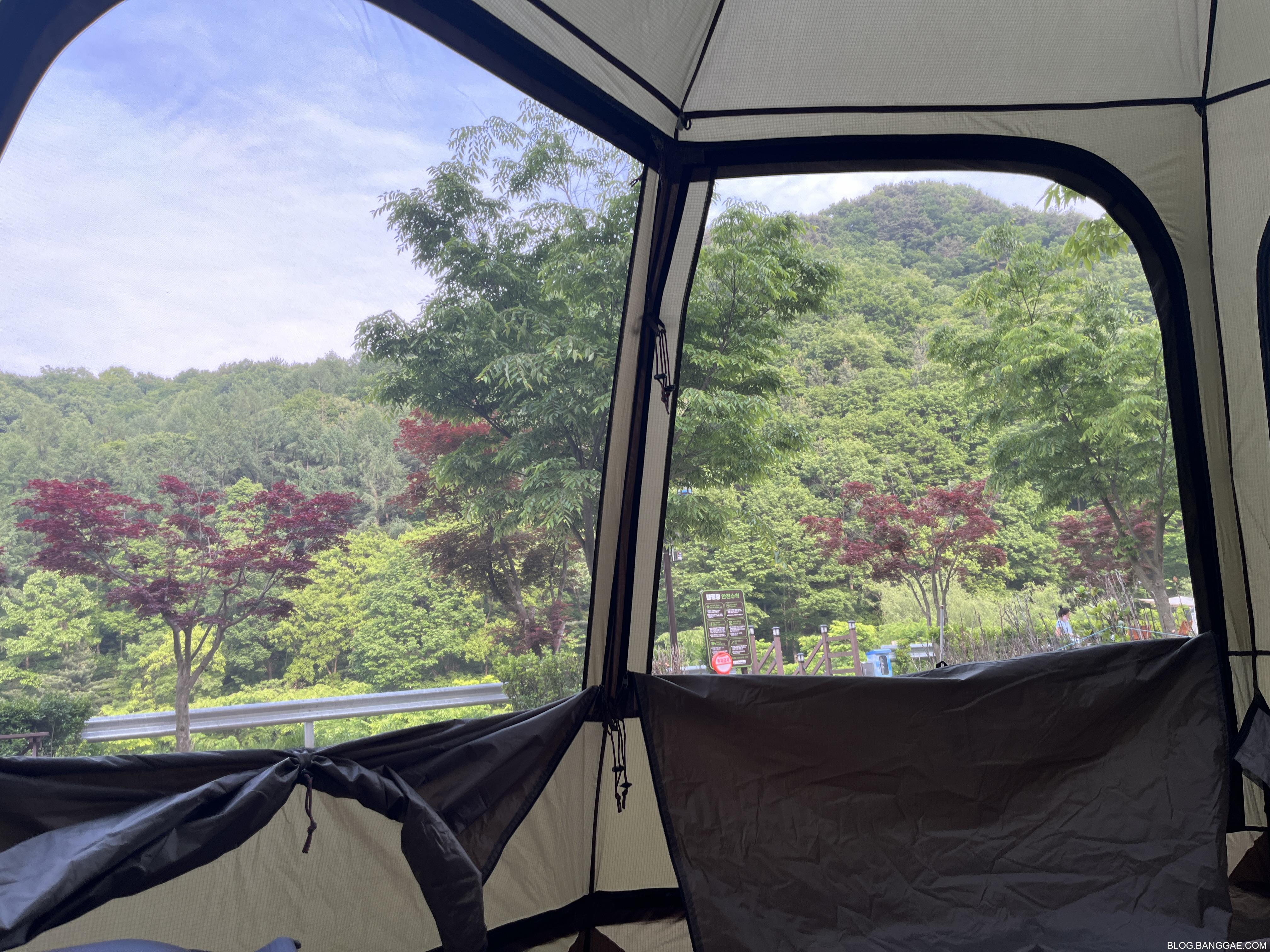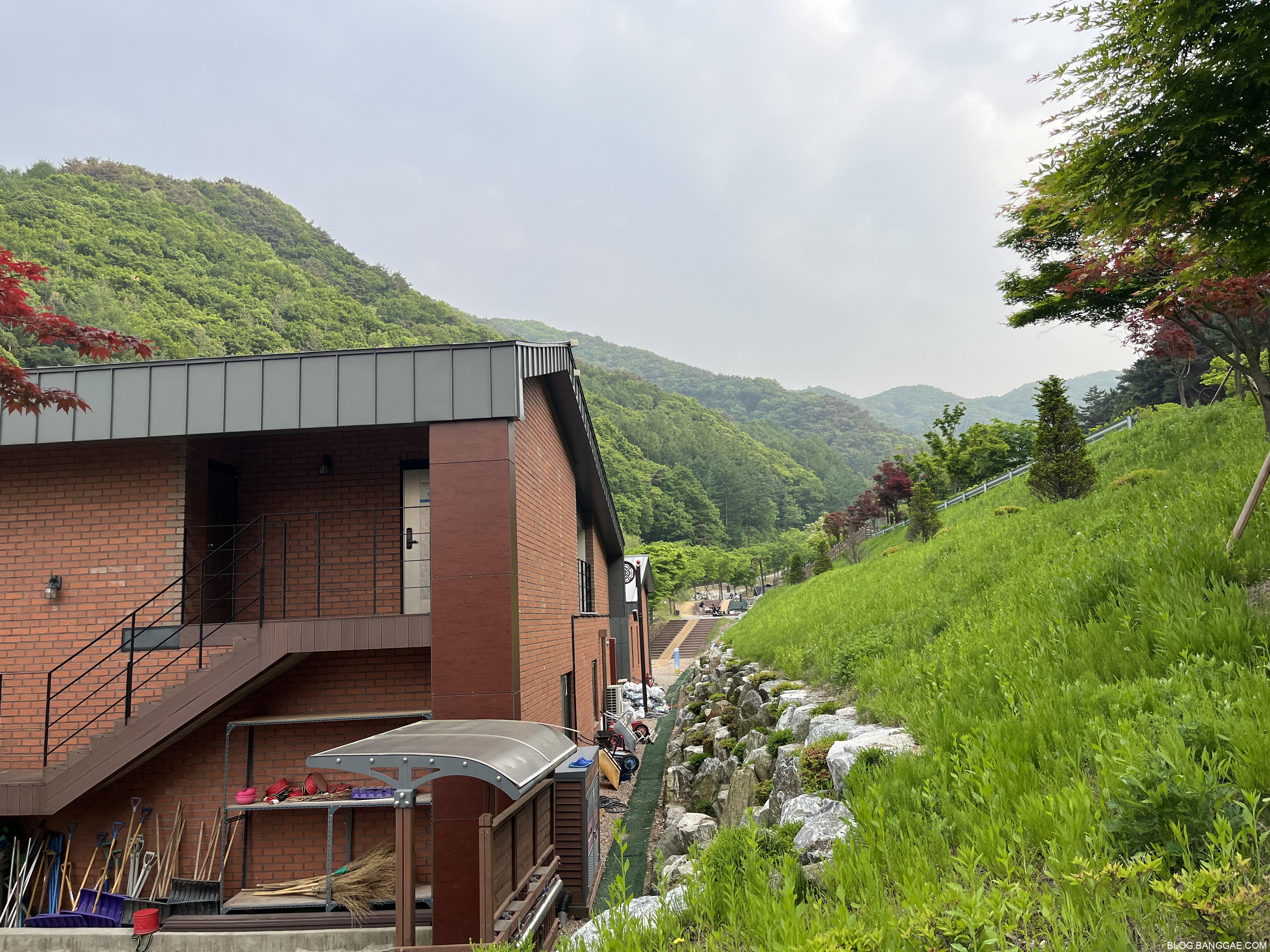 1캠핑장의 경관은 산이 보여 좋습니다. 2캠핑장쪽은 앞에 물이 흐르고 있어 아이들이 뛰어 놀기는 좋지만 조금은 소란스러운 분위기입니다. 사진에 보이는 1,2번쪽 라인이 뒷쪽 라인보다는 경치가 더 좋습니다. 사람들이 오가는 계단쪽은 조금 불편 할 수도 있겠네요.