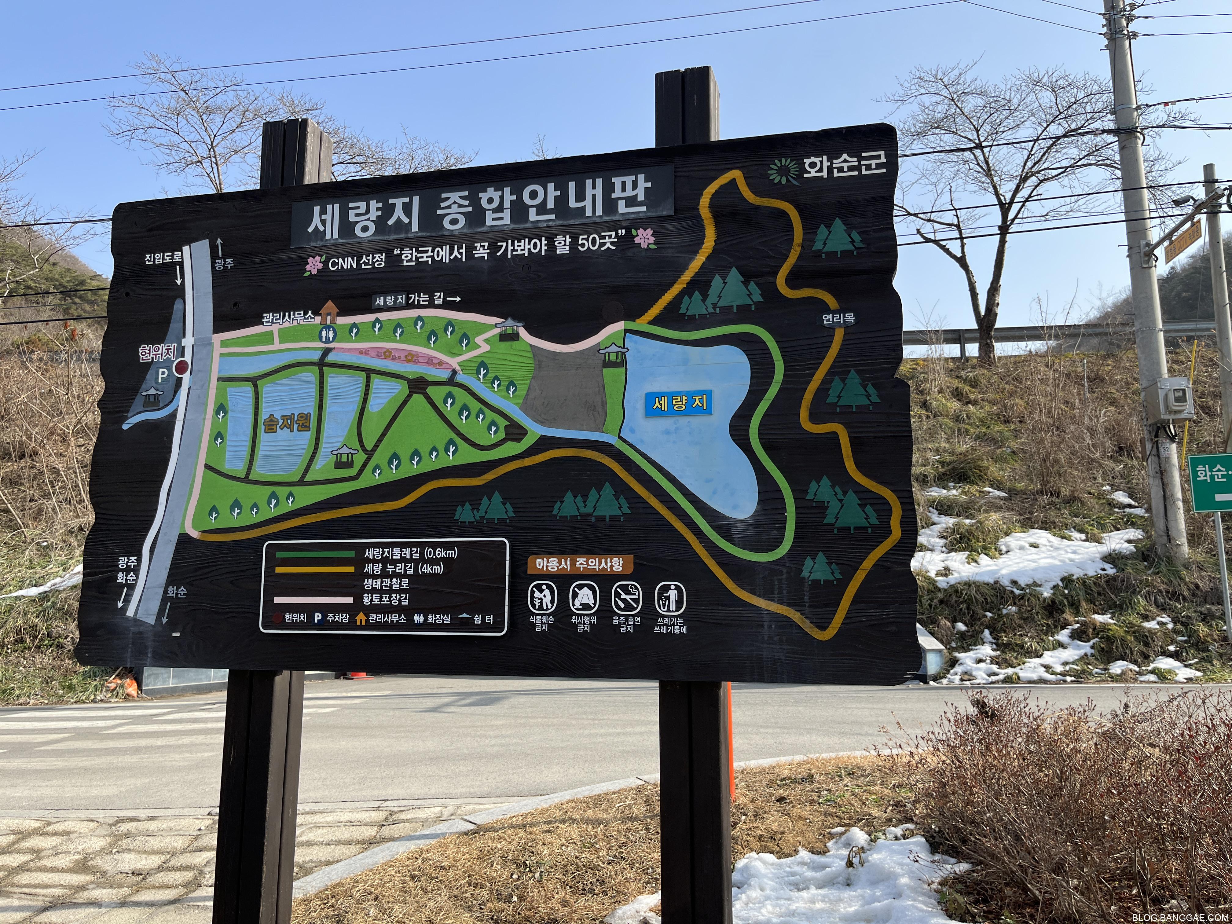 화순에 온김에 세량지라는 cnn에서 극찬한 유명한 곳이 있다고 하길래 차를 타고 가봤습니다. 원래는 꽃피는 봄에 갔었어야 하는 곳인데 겨울이라 산책하는 사람들은 드문드문 보이는데 아쉽게도 겨울에는 그냥 저수지의 모습이었습니다.