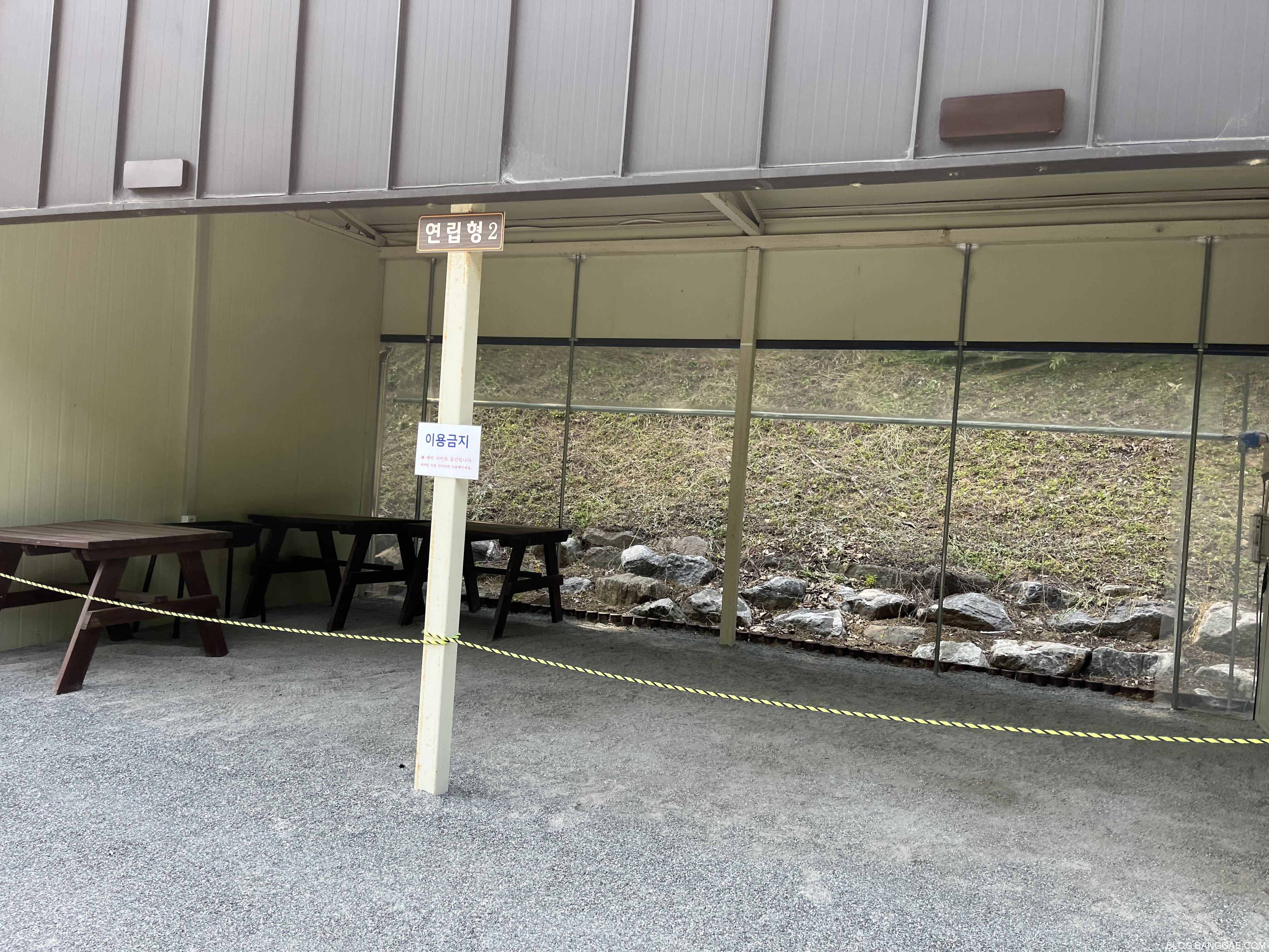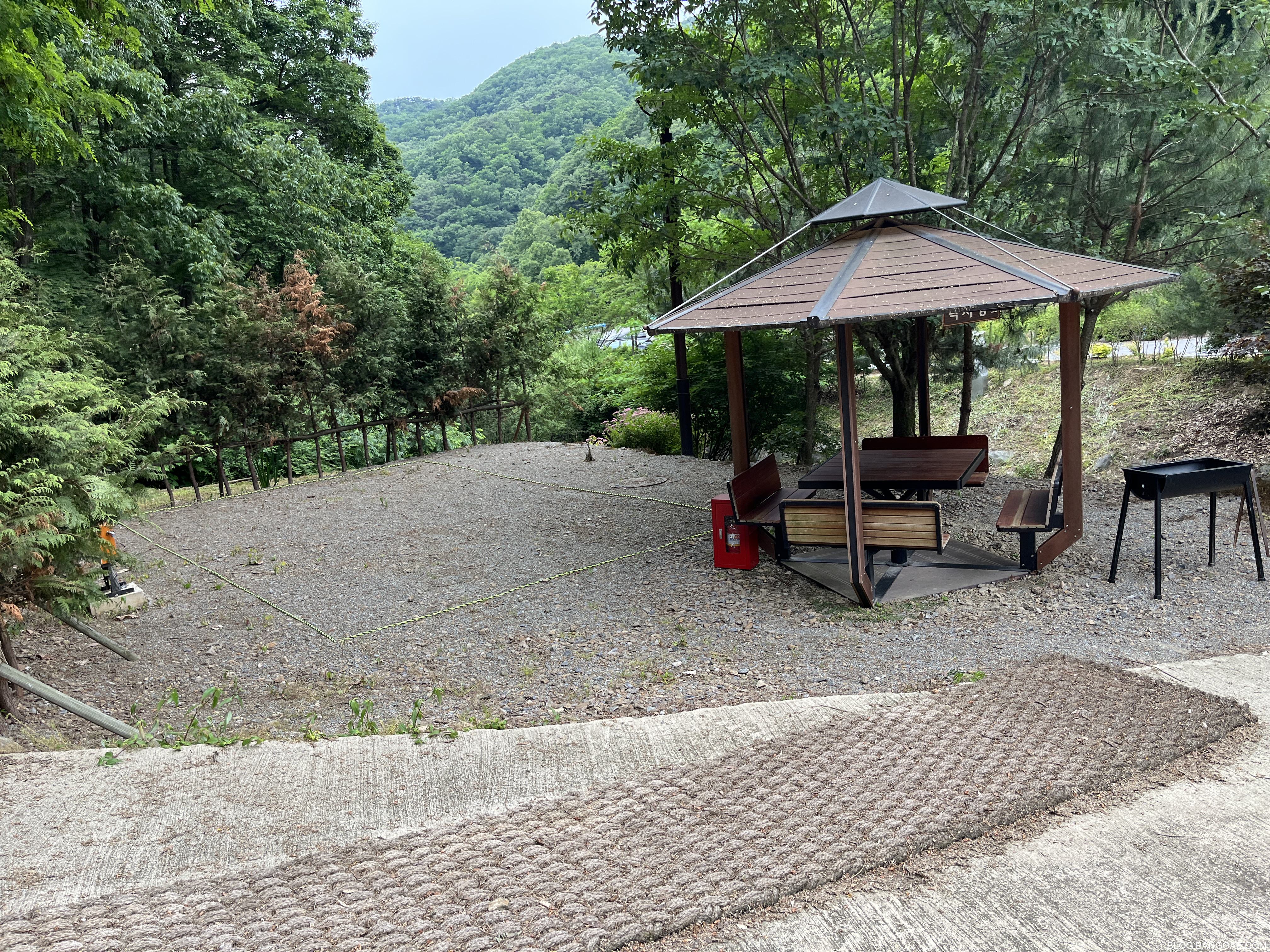 연립형은 5개인데 현재는 1,3,5만 사용 가능 한 것 같습니다. 지붕이 있어 날씨가 좋지 않을때 장점이 있을 것 같아 선택 했습니다만 일기 예보가 맞지 않아 조금 아쉬움이 있었습니다. 원래는 캠핑 용도가 아니라 바베큐장이었다는 것 같습니다.