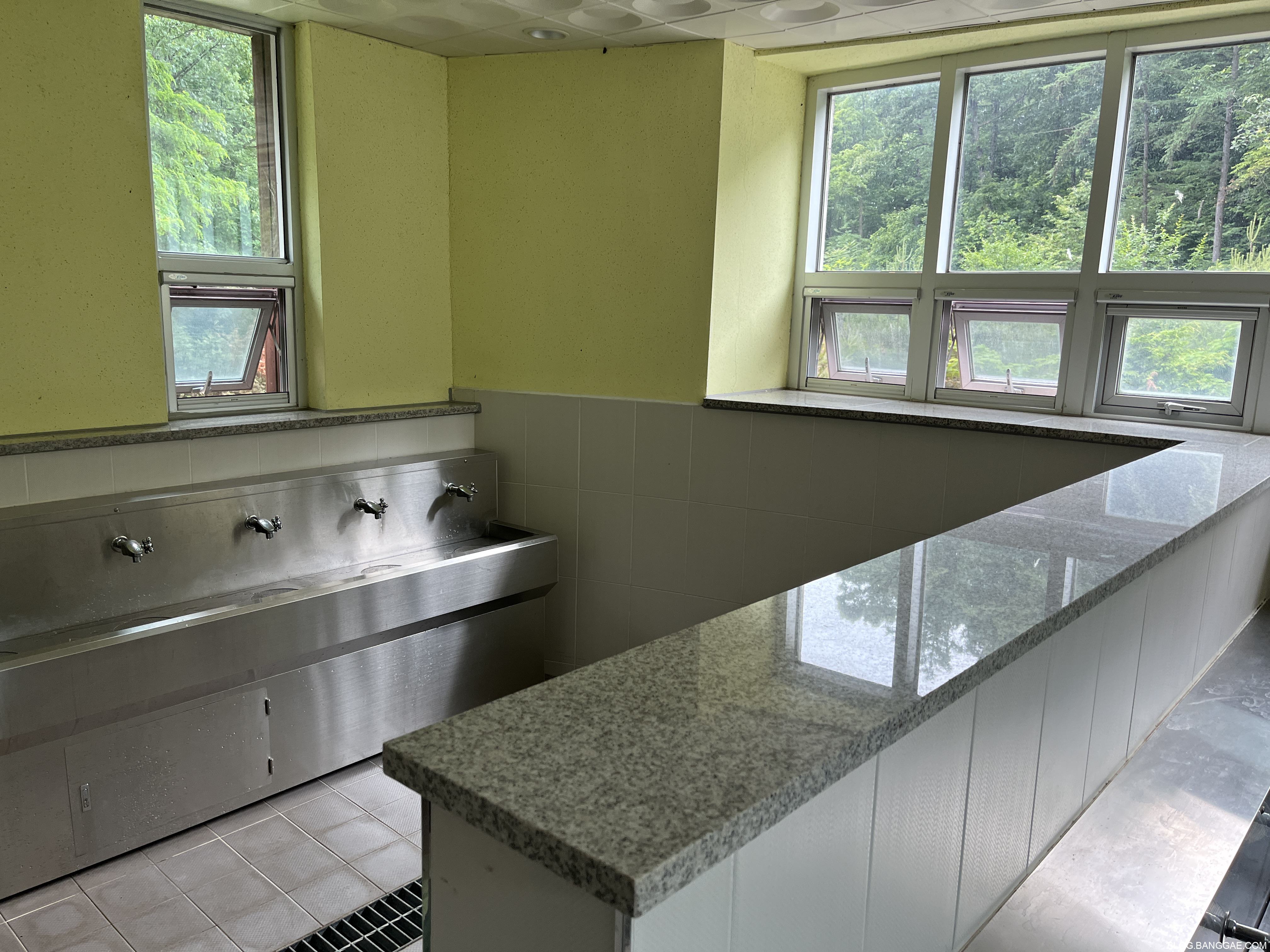 개수대는 냉수만 나오는데 환경은 깨끗합니다. 화장실이 바로 옆에 있고 샤워실도 있는데 샤워실에는 온수가 나옵니다.