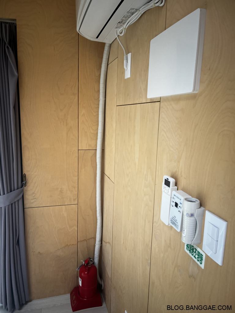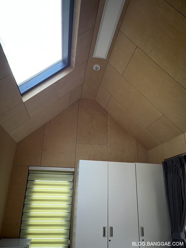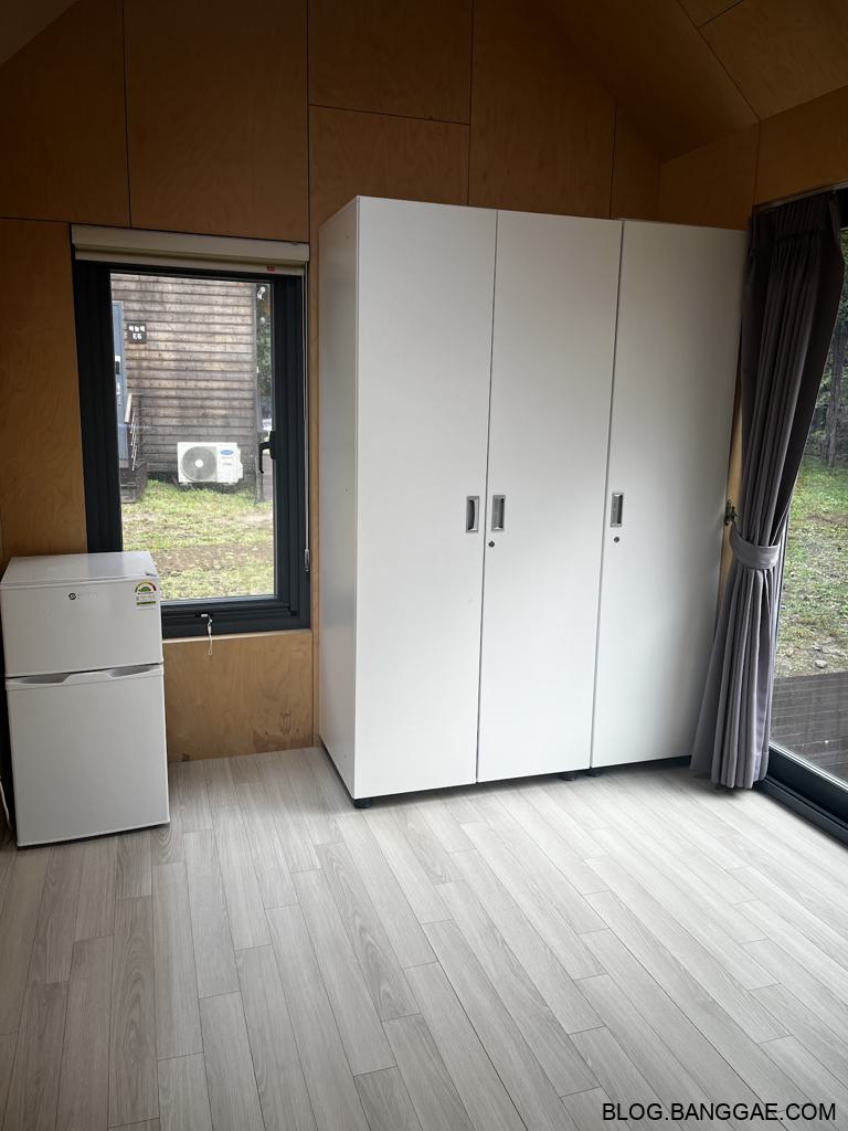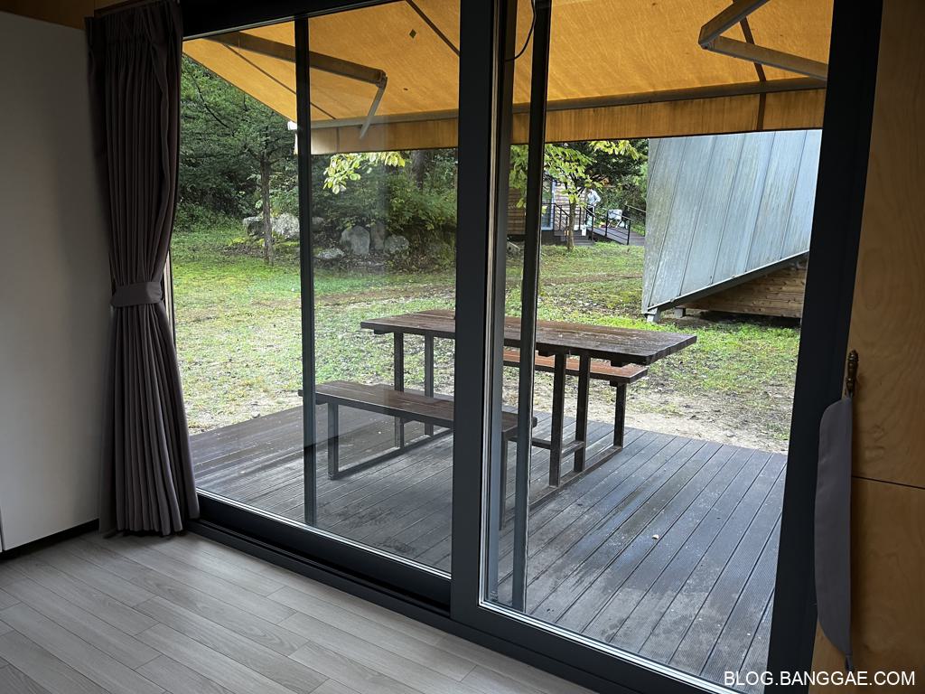 내부는 옷장,작은 냉장고,에어컨,보일러,데크로된 테라스에 테이블이 있는 구조입니다. 물을 사용 할 수 있는 싱크대나 화장실은 외부에 다른 건물을 사용해야 해서 불편함은 있지만 텐트를 치지 않아도 되는 편리함이 있습니다. 많이 걷지 않아도 되는 위치에 있어 큰 불편함은 없었지만 역시 화장실은 조금 불편하긴 합니다.