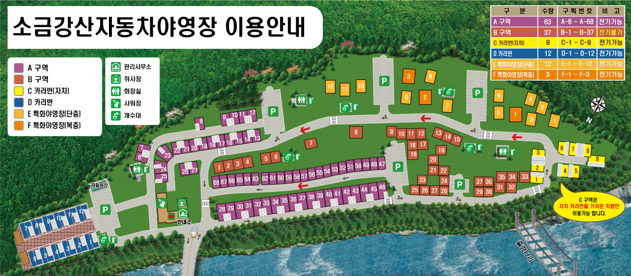 야영장 배치도는 아래 사진으로 확인해 볼 수 있는데 A구역 야영장들은 간격이 너무 좁아 보이더군요. 그래도 샤워장등의 시설은 안내소 건물에만 있으니 샤워장 접근성은 좋아 보입니다. 사진상의 출렁 다리를 넘어가면 바로 식당가와 편의점이 있는 것도 이 야영장의 장점 입니다.