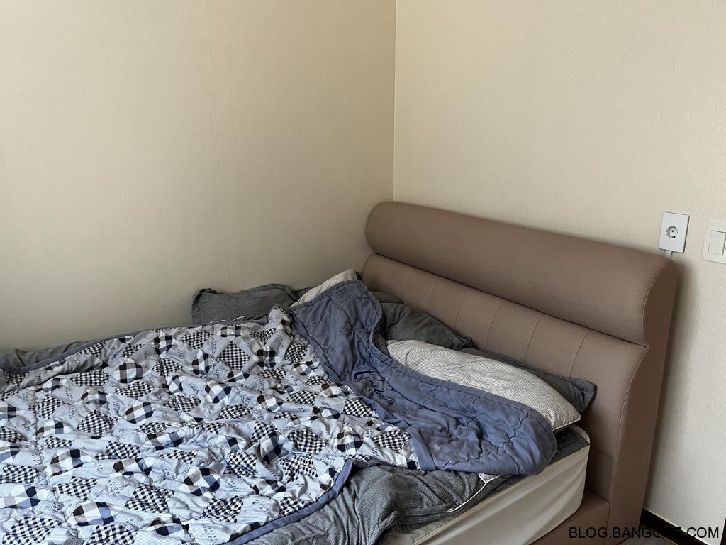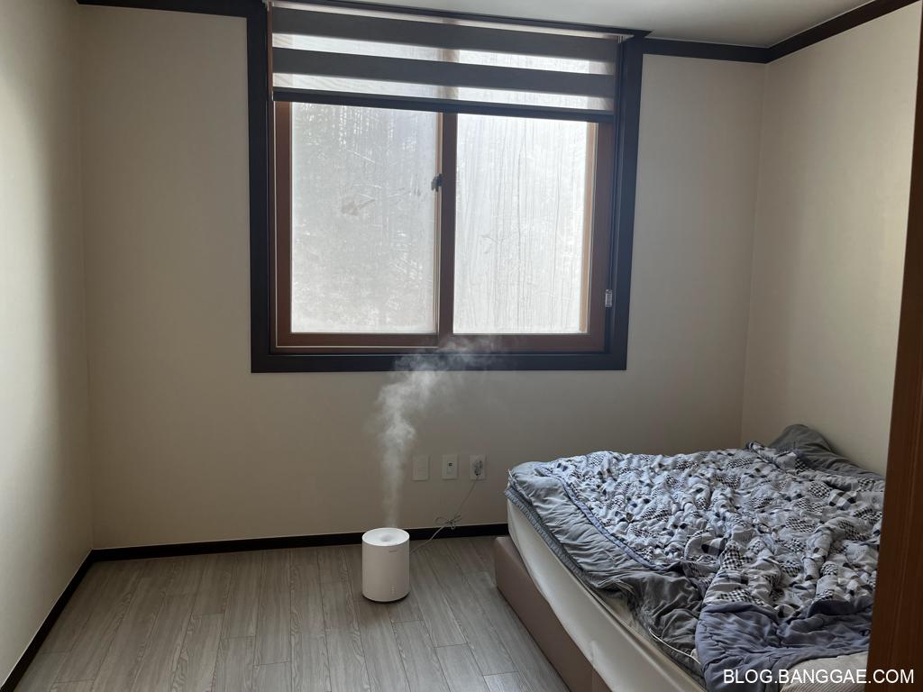 휴양관은 거실겸 주방과 화장실 , 침실로 이루어져 있으며 공간은 4인이 사용하기 충분한 크기 입니다. 이 곳 휴양관 침실에는 침대가 있습니다. 사진의 가습기는 집에서 가져 간 것인데 휴양림에 놓고 왔네요. 침실은 넓은 편이고 따뜻합니다.
