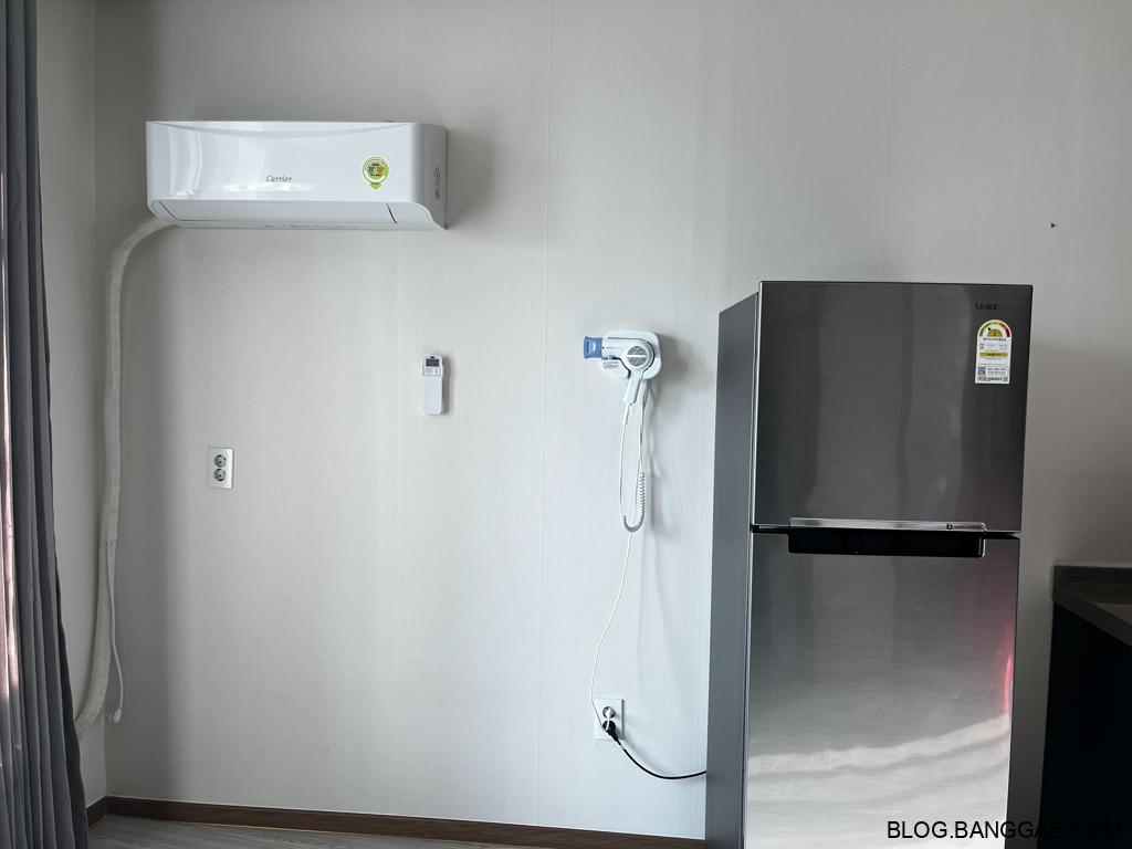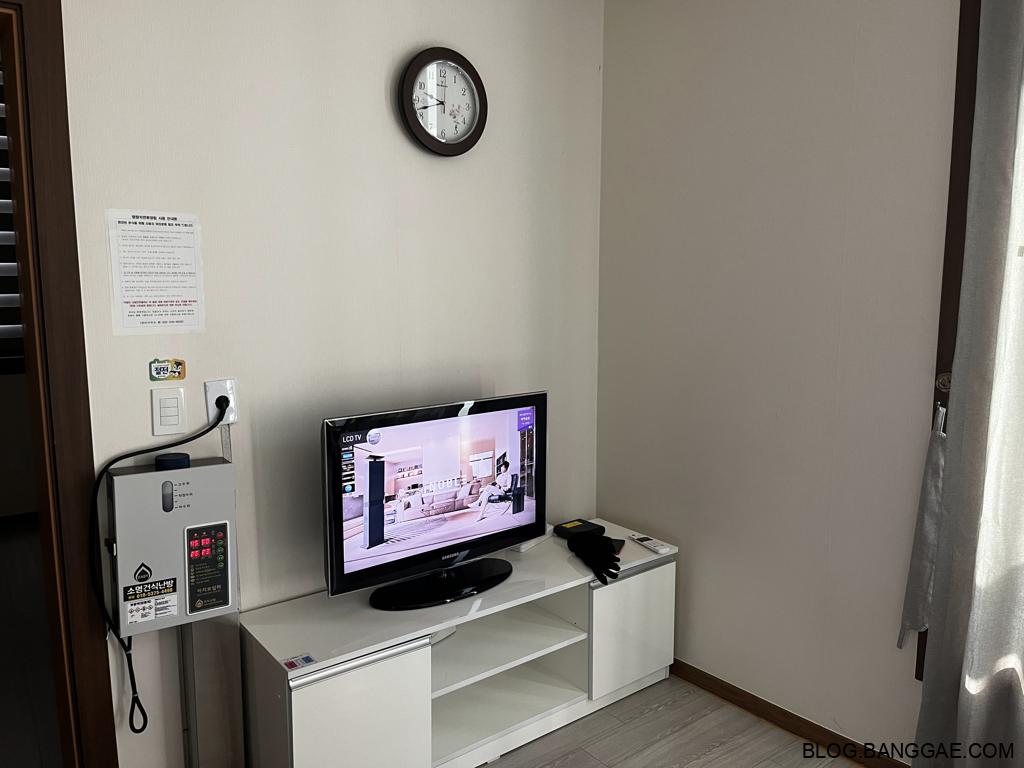 거실의 티비와 옆에 보일러 입니다. 케이블 TV와 무선 인터넷도 사용 가능 합니다. 에어컨과 냉장고는 다른 곳에서도 있는데 드라이기도 있습니다. 드라이기 있으니 편해요. 다른 휴양림도 드라이기가 있으면 좋을 것 같네요.
