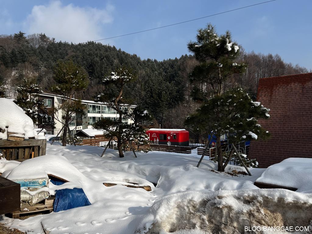 다음날 용평에 있는 발왕산 케이블카를 타는 일정이 있어 평창자연휴양림에서 숙박을 했습니다. 눈이 많이 오고 나서 인지 휴양림에 사람은 많지 않았고 산책로도 다 막혀 있어 숙박만 하고 건물 주변 산책만 하고 나오게 되었습니다.