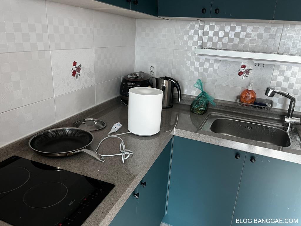 주방에는 밥솥 조리를 할 수 있는 하일라이트 , 커피포트가 있습니다. 후라이팬등 기본 적인 조리기구도 다 갖추고 있습니다. 사진에 보이는 하얀 가습기는 개인 물품입니다.