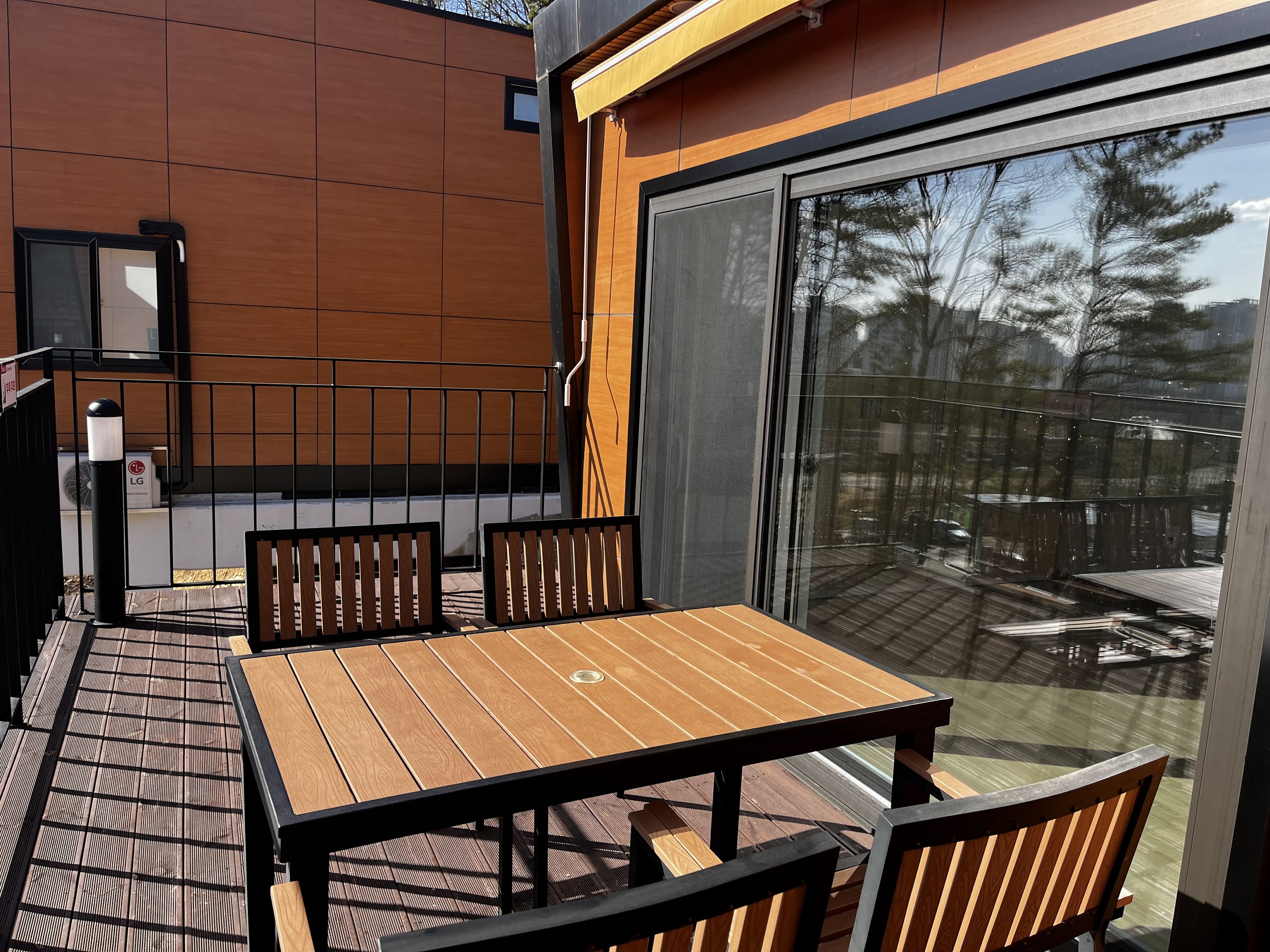 야외 테이블과 어닝도 있지만 날씨가 쌀쌀해 사용해 보지는 못 했습니다. 오픈한지 얼마 안된 건물이라 시설 컨디션은 좋은 편이나 샷시 상태는 별로 입니다. 거실에서 잠을 잤는데 외풍이 좀 있었습니다.
