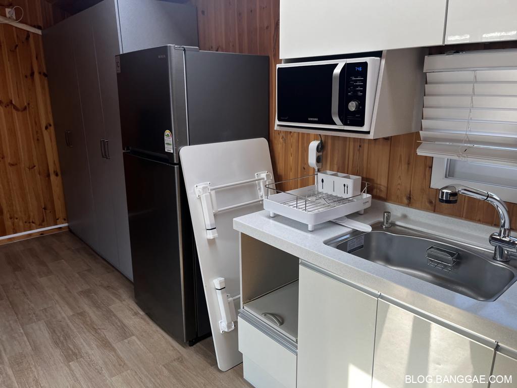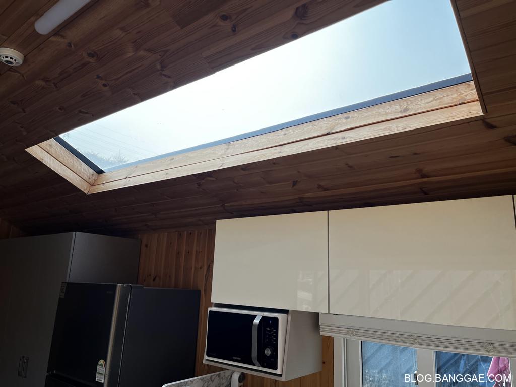 숙소 내부 사진은 다음과 같습니다. 싱크대와 냉장고 전자렌지 접혀 있는 좌식 테이블 옷장 하나 티브가 한대 있고 인터넷이 사용 가능 합니다. 천장은 하늘이 보이게 되어 있어 채광이 좋습니다.