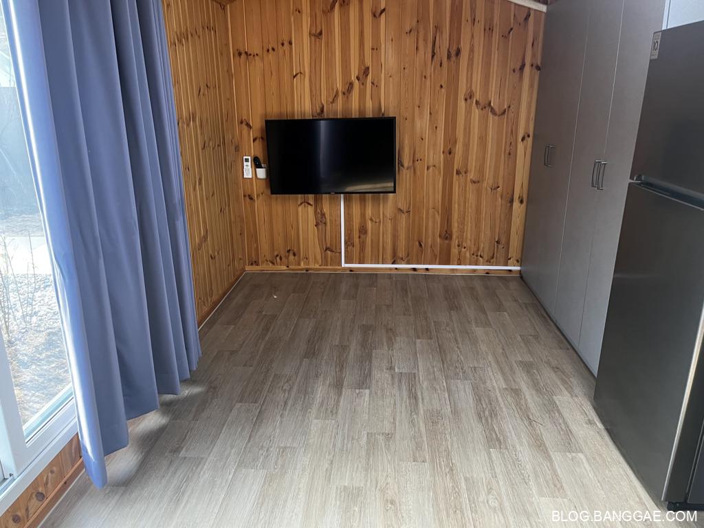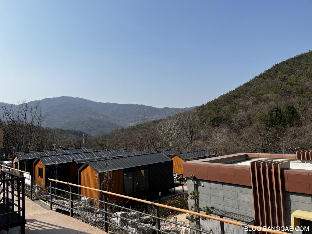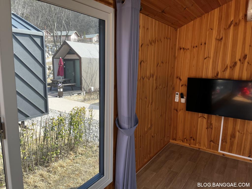 간단한 체크인을 하고 숙소로 짐을 옮겼습니다. 숙소는 하우스 B42 였습니다. 방구조상 북한산 백운대 방향이 아니라 상장봉 쪽이 보이는 구조이며 옆 하우스와 많이 떨어져 있지 않아 소음에 자유롭지는 않습니다. 넓지 않은 공간에 동선이 집앞이나 옆으로 지나가는 구조 입니다.