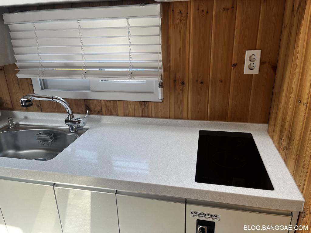 숙소 내부 사진은 다음과 같습니다. 싱크대와 냉장고 전자렌지 접혀 있는 좌식 테이블 옷장 하나 티브가 한대 있고 인터넷이 사용 가능 합니다. 천장은 하늘이 보이게 되어 있어 채광이 좋습니다.