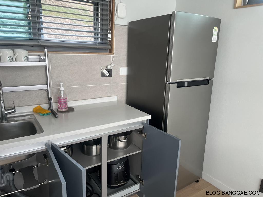 TV와 냉장고, 인덕션(이곳은 하이라이트가 아닌 인덕션이 있네요) 그리고 각종 식기류 등이 모두 있어 몸과 먹을 것만 가지고 들어오면 되는 곳입니다.