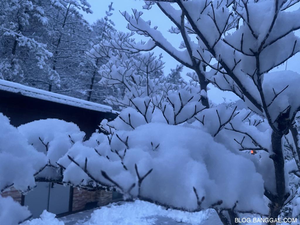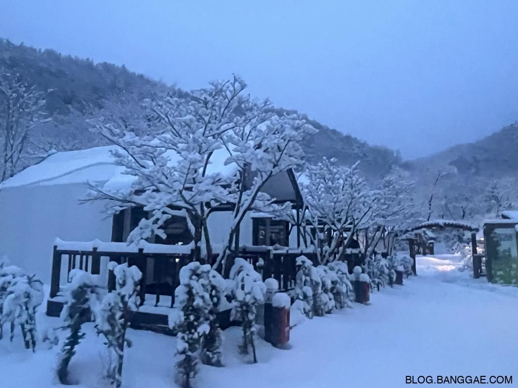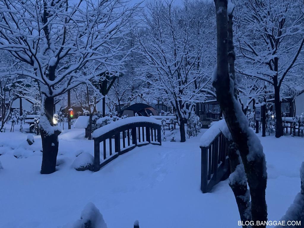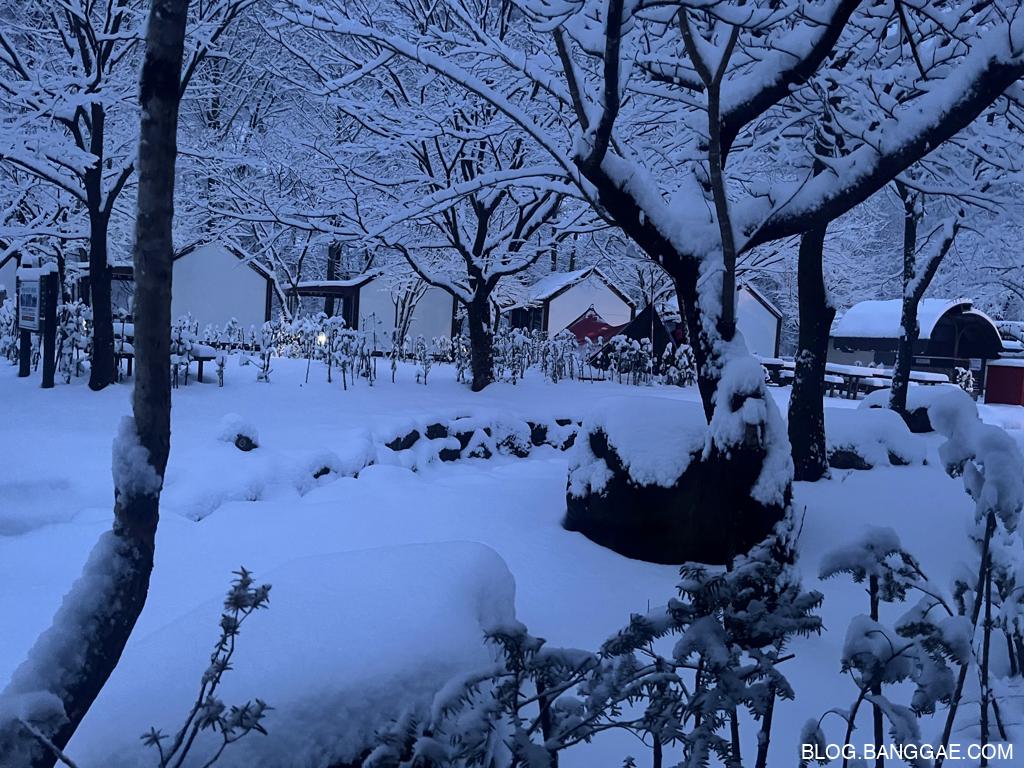 다음 날 아침, 눈이 많이 내려 캠핑장의 풍경은 하얀 설원으로 변했습니다. 하지만 이 아름다움 뒤에는 예상치 못한 고생이 기다리고 있었습니다. 폭설로 인해 길을 만들어 짐을 옮기고, 높은 지대에 위치한 캠핑장을 내려오는 일이 쉽지 않았습니다. 특히 눈길에서의 이동은 체력과 인내를 요구했죠. 이런 상황에서도 겨울 경치는 정말 매력적이었습니다.