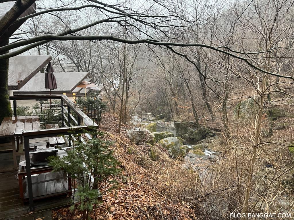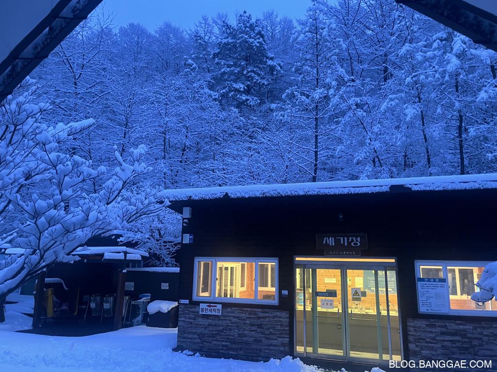 삼가 야영장은 친환경적으로 운영되며, 화장실, 샤워실, 취사장 등 기본적인 시설이 잘 갖춰져 있습니다. 특히 샤워장은 깔끔하게 관리되어 있었고 온수가 나오는 시간에는 따뜻하게 이용할 수 있었습니다. 야영장 내에는 실개천이 있어 여름철 물놀이 장소로도 좋지만, 겨울엔 그저 눈 덮인 자연을 감상하는 장소가 됩니다.