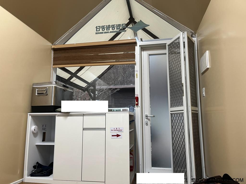 캠핑 첫날 저녁, 하우스 B-4에서 머물렀습니다. 이 숙소는 작은 원룸 형태로 바닥 난방이 잘 되어 있어 따뜻하게 쉴 수 있었습니다. 내부에는 아이스박스가 제공되었으며, 개수대와 샤워장이 가까운 위치에 있어 편리했습니다. 샤워장은 무료로 이용할 수 있었지만 온수는 지정된 시간에만 나왔습니다. 짐은 주차장에서 카트를 이용해 옮겨야 하는 시스템이라 이동이 조금 번거롭지만, 이 과정도 하나의 경험으로 느껴졌습니다.