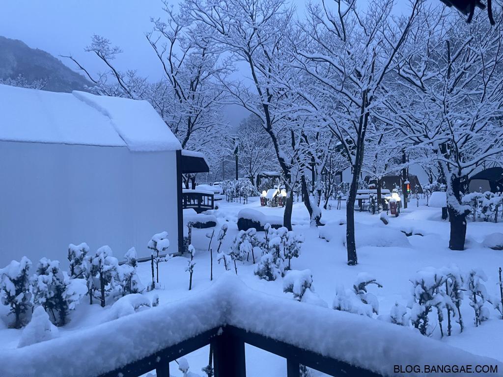 다음 날 아침, 눈이 많이 내려 캠핑장의 풍경은 하얀 설원으로 변했습니다. 하지만 이 아름다움 뒤에는 예상치 못한 고생이 기다리고 있었습니다. 폭설로 인해 길을 만들어 짐을 옮기고, 높은 지대에 위치한 캠핑장을 내려오는 일이 쉽지 않았습니다. 특히 눈길에서의 이동은 체력과 인내를 요구했죠. 이런 상황에서도 겨울 경치는 정말 매력적이었습니다.