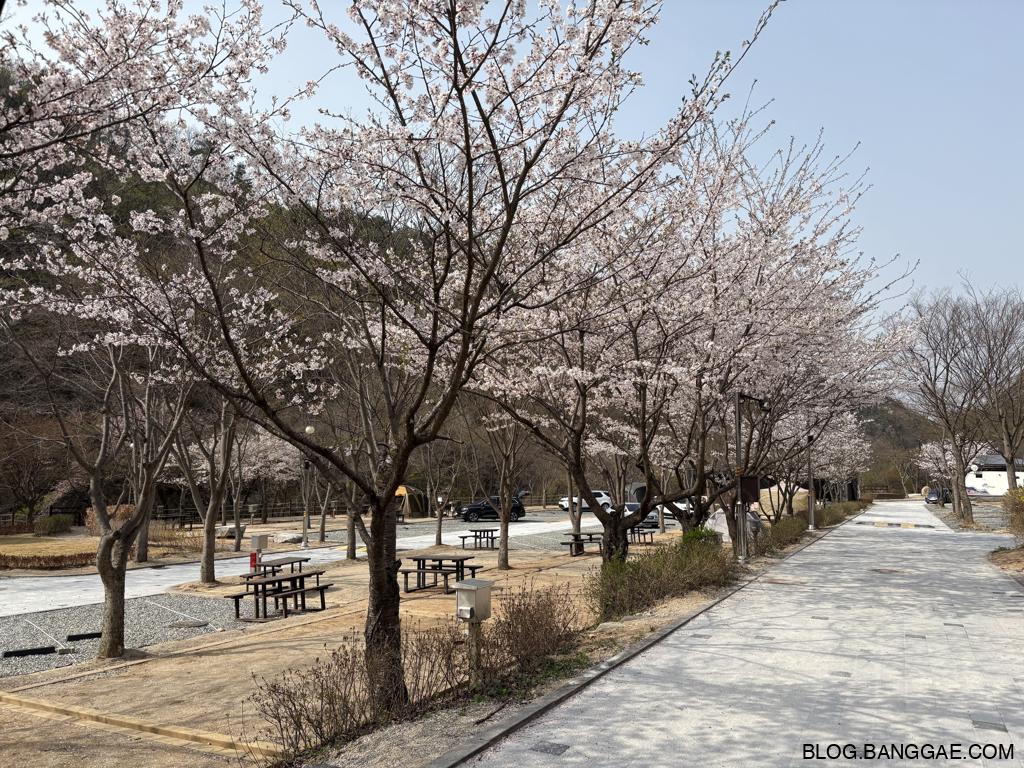 야영장에 들어서자마자 펼쳐진 벚꽃길은 그야말로 환상적인 풍경이었어요. 바람에 흩날리는 벚꽃잎은 눈처럼 하늘에서 내려오고, 그 아래에서 보내는 하루는 진정한 힐링 그 자체였습니다.