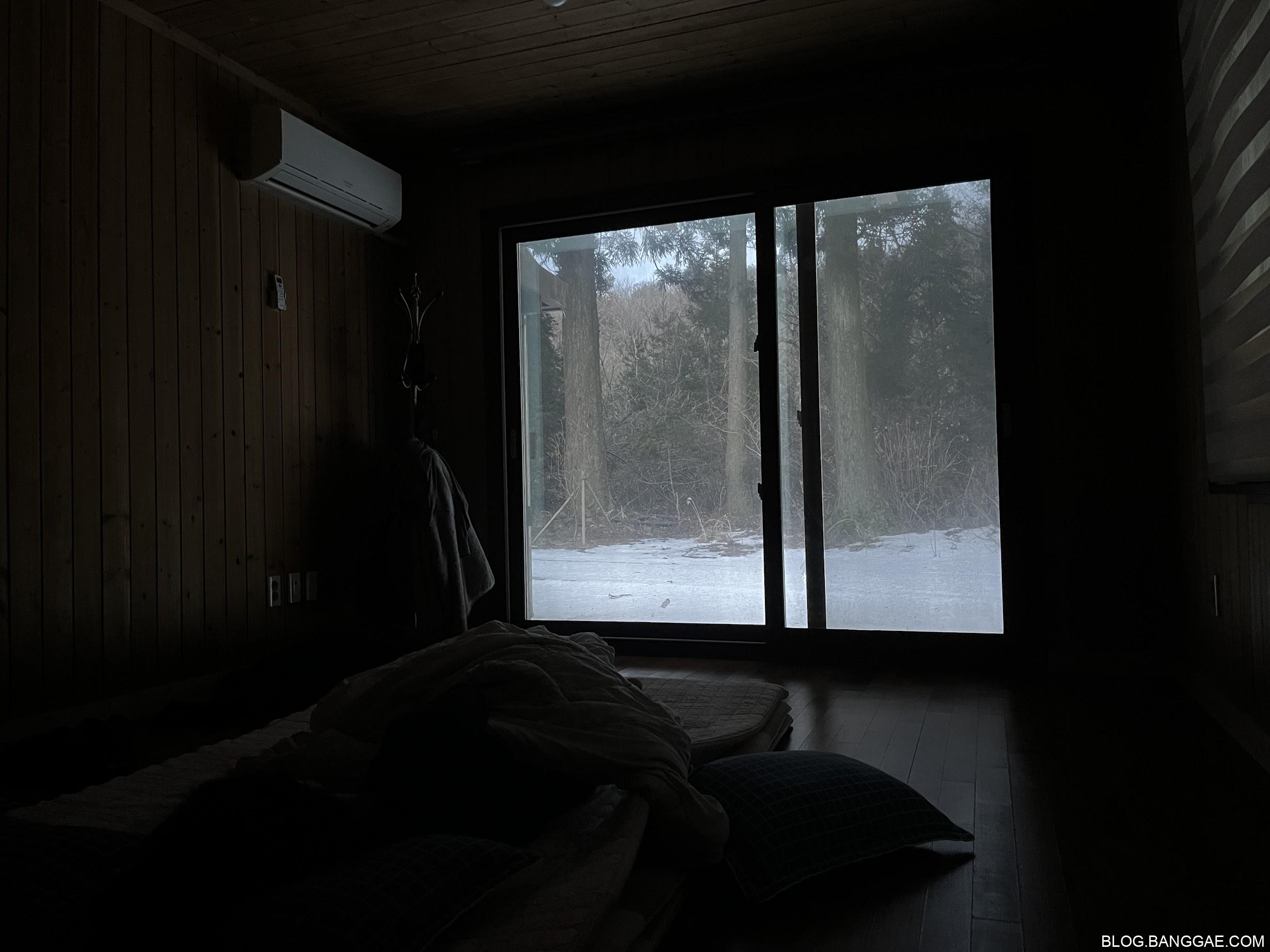 아침에 방에서 바라본 숲의 모습입니다. 통창이라 블라인드를 내리고 잤다가 아침에 블라인드를 걷으니 조용하고 아늑한 느낌이 드네요.